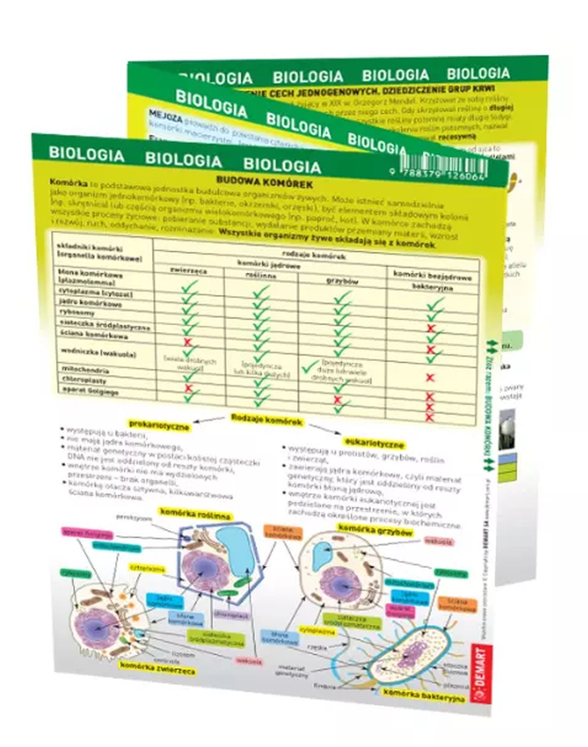Zestaw ściągawek do biologii w formie składanej harmonijki. 6 stron najważniejszych wzorów, definicji, schematów i twierdzeń. Ściągawka obejmuje tematy takie jak:- dziedziczenie cech jednogenowych, dziedziczenie grup krwi- budowa komórek- mitoza i mejozaMAXI ściąga - pomocna na lekcji, podczas odrabiania pracy domowej, a nawet przy nauce do klasówki. Włożona do zeszytu, zawsze pod ręką - gdy z głowy wyleci potrzebny wzór czy data.