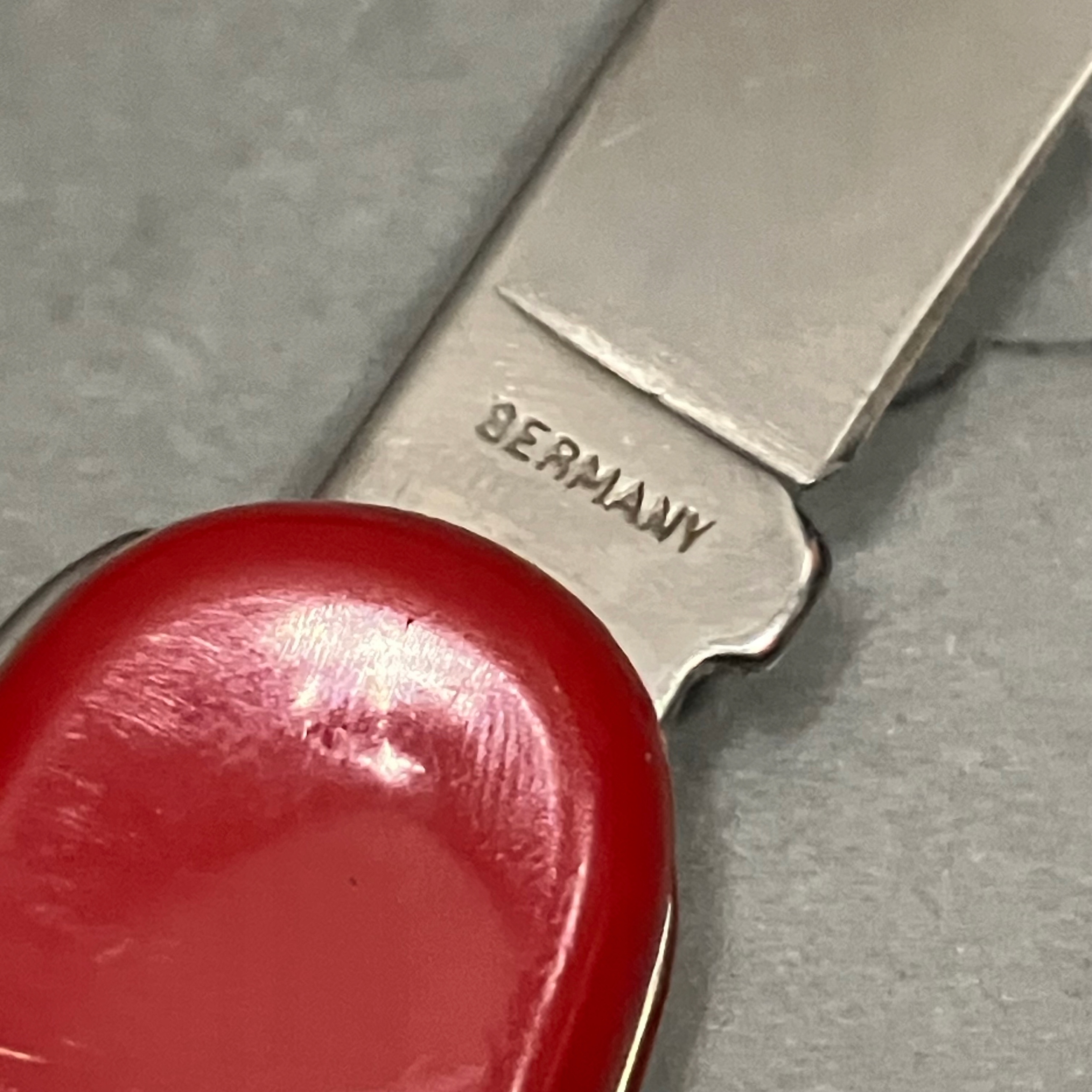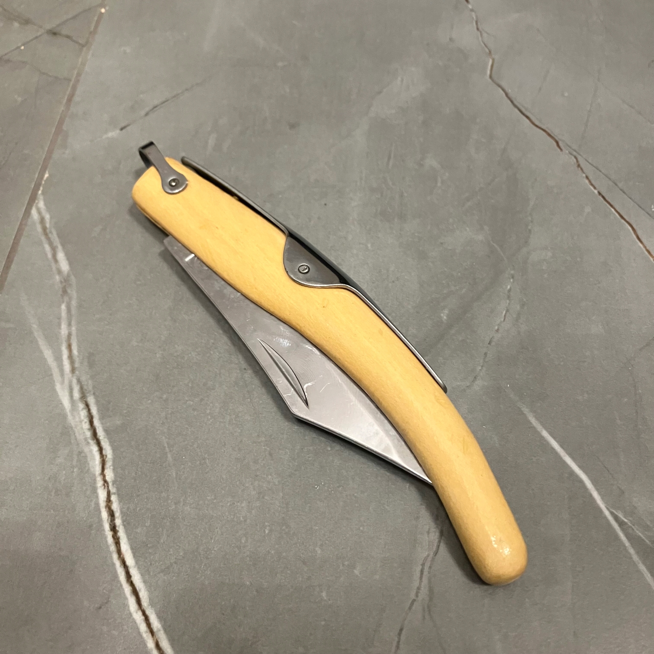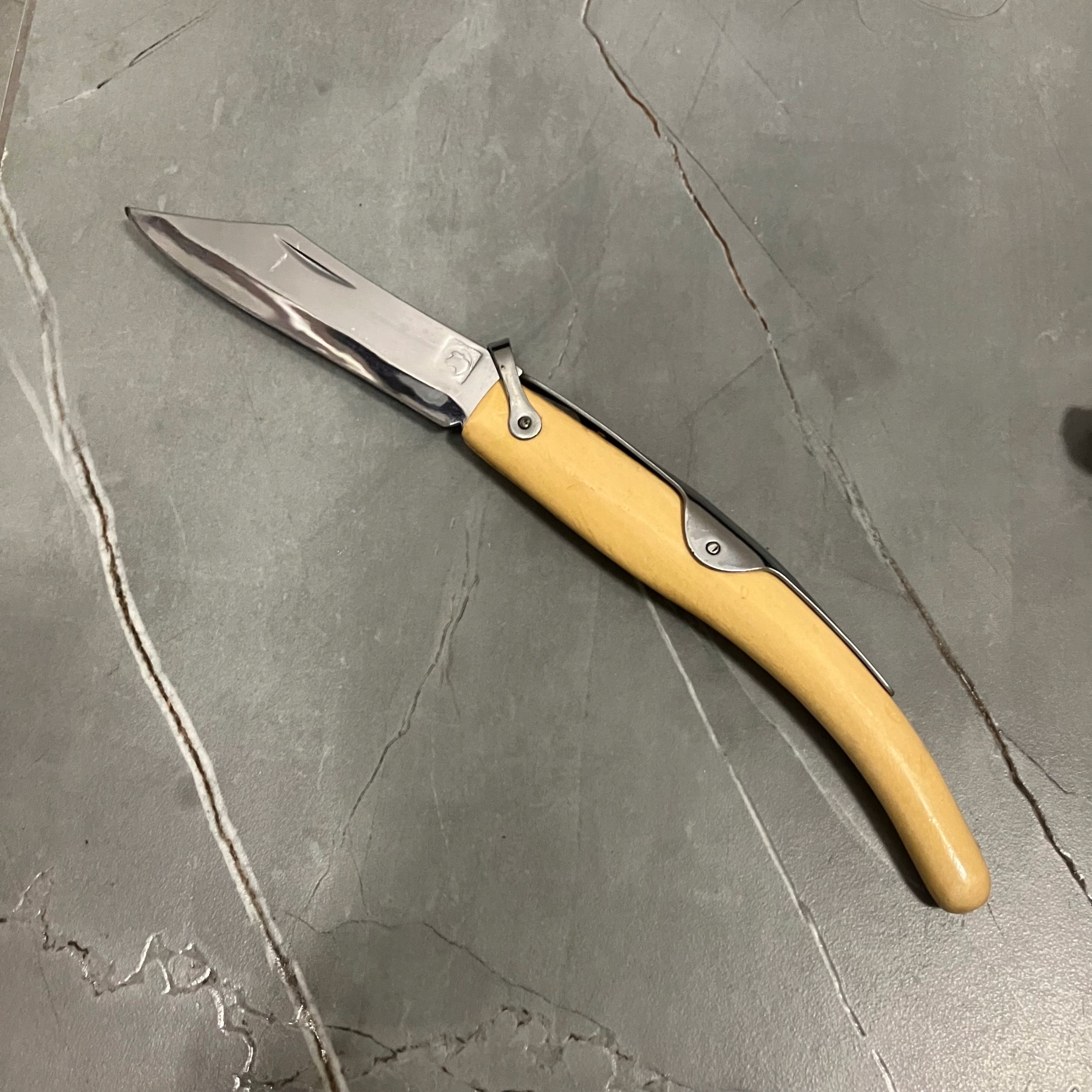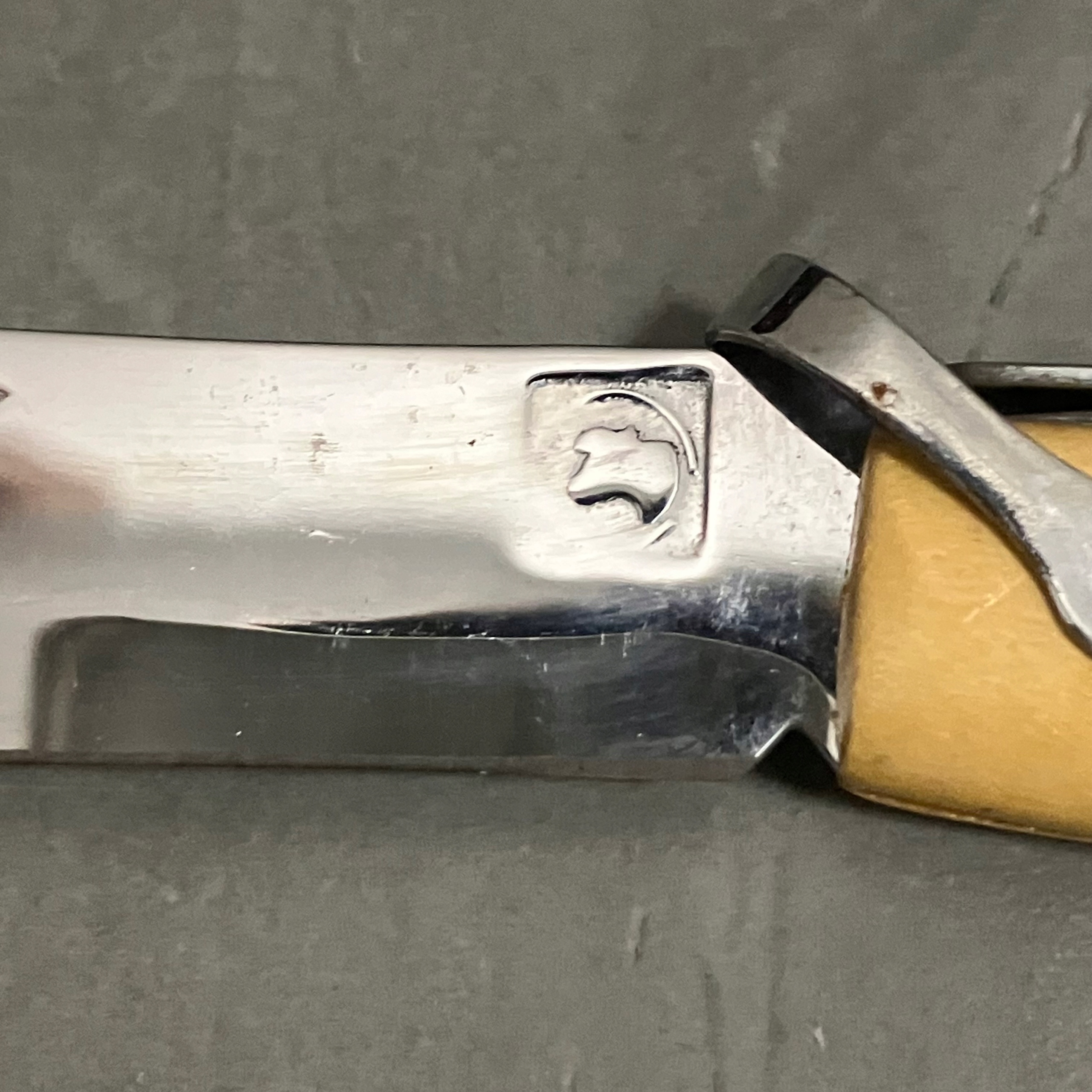 Biały nożyk składany, sygnatura widoczna na szóstym zdjęciu