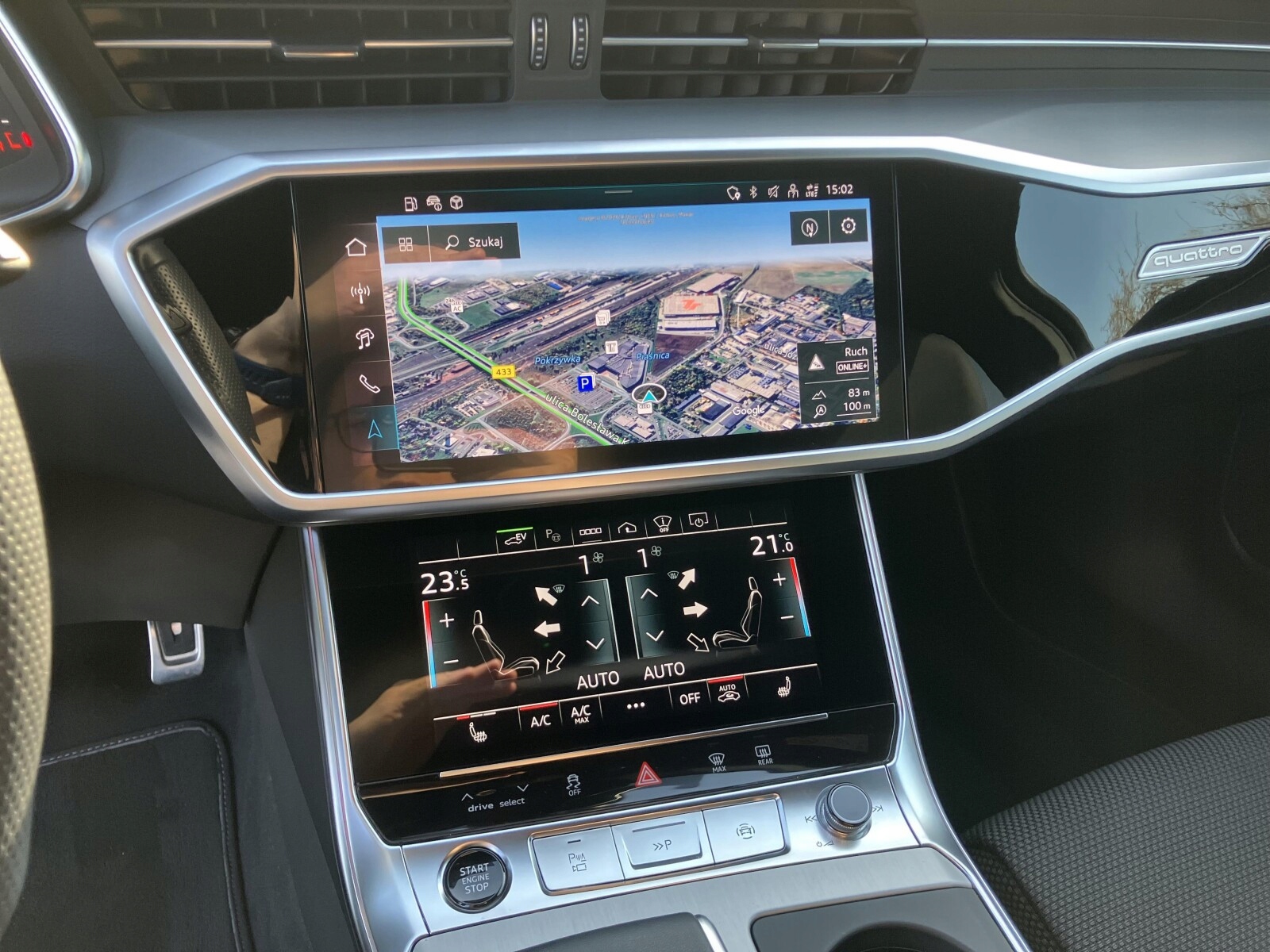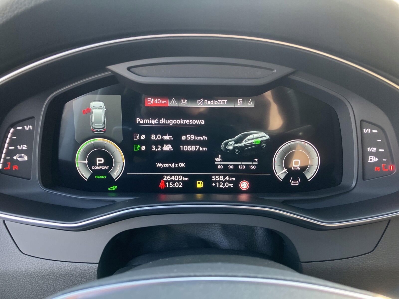 Adaptacyjny asystent jazdy z Emergency Assist (6I6).Adaptacyjny tempomat (8T5).Asystent zmiany pasa (Side Assist) z systemem ostrzegania przy wysiadaniu (7Y1).Asystent skrzyżowań i ruchu poprzecznego (JX1).Kluczyk komfortowy (PGC) z czujnikiem zwalniającym blokadę pokrywy bagażnika.Pilot bramy garażowej (VC2) (HomeLink).Klimatyzacja postojowa (GA1).4-strefowa komfortowa klimatyzacja automatyczna (9AQ).Fotele sportowe z przodu (Q1D).Przednie siedzenia z elektryczną regulacją i pamięcią ustawień dla fotela kierowcy (PV3).Ogrzewanie przednich i tylnych siedzeń (4A4).Pakiet oświetlenia Ambiente plus (QQ2).MMI Navigation plus z MMI touch response (7UG).Audi virtual cockpit.Audi sound system (9VD).Audi smartphone interface z Application Store (IU4).Audi phone box (9ZE) (współpraca z LTE).Zawieszenie sportowe (1BE).Przyciemnione szyby przeciwsłoneczne (QL5).Szyby boczne i tylna z izolacją termiczną.Relingi dachowe czarne.Spojler dachowy RS (5J4).Obręcze kół ze stopu metali lekkich 19-calowe, 5-ramienne (42R).Kierownica wielofunkcyjna z łopatkami zmiany biegów.Przygotowanie do montażu haka holowniczego (1D8).Kabel do ładowania Mode 3 typ 2 (32 A).