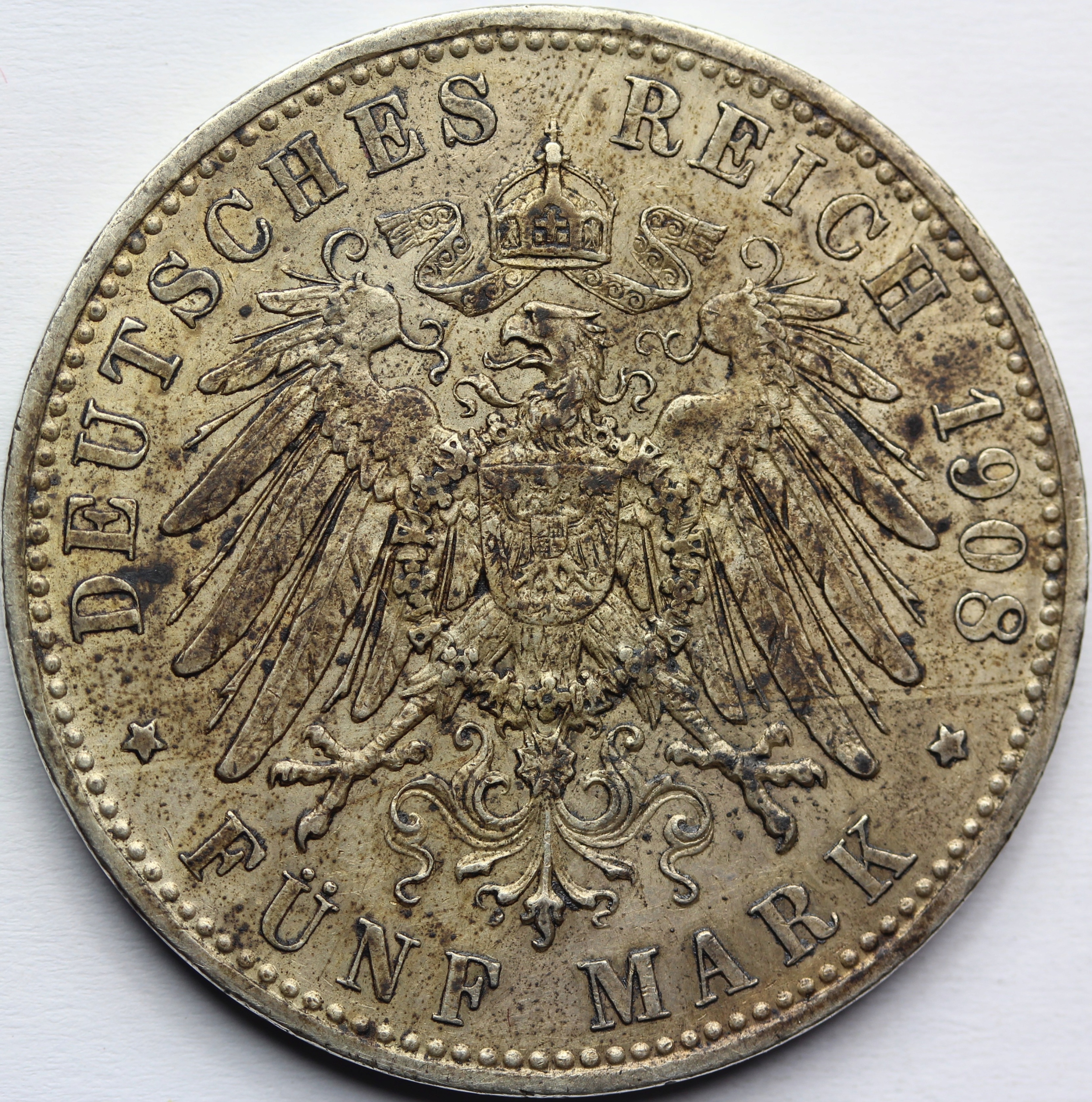 NA AUKCJI WYSTAWIANA JEST PRZEPIĘKNA STARA ORYGINALNA i RZADKA SREBRNA MONETA - 5 MAREK - KAISERREICH SAKSONIA-MEININGEN 1908 D - JERZY II - RZADKA - ORYGINAŁ - RARYTAS - NA INNYCH AUKCJACH WYSTAWIAM MONETY Z TEJ SERII - ZAPRASZAM DO OGLĄDANIA - 12/18/03/26