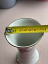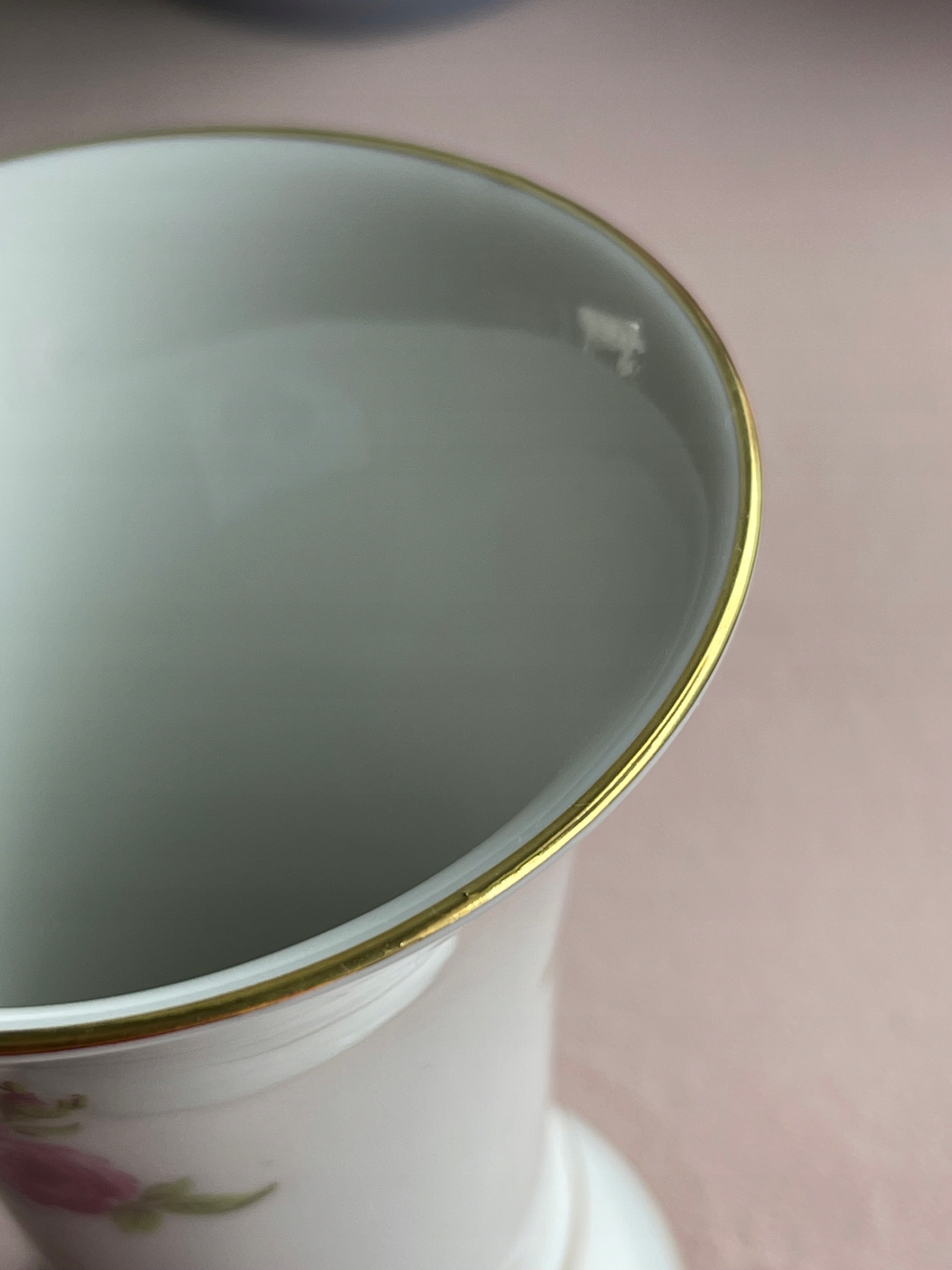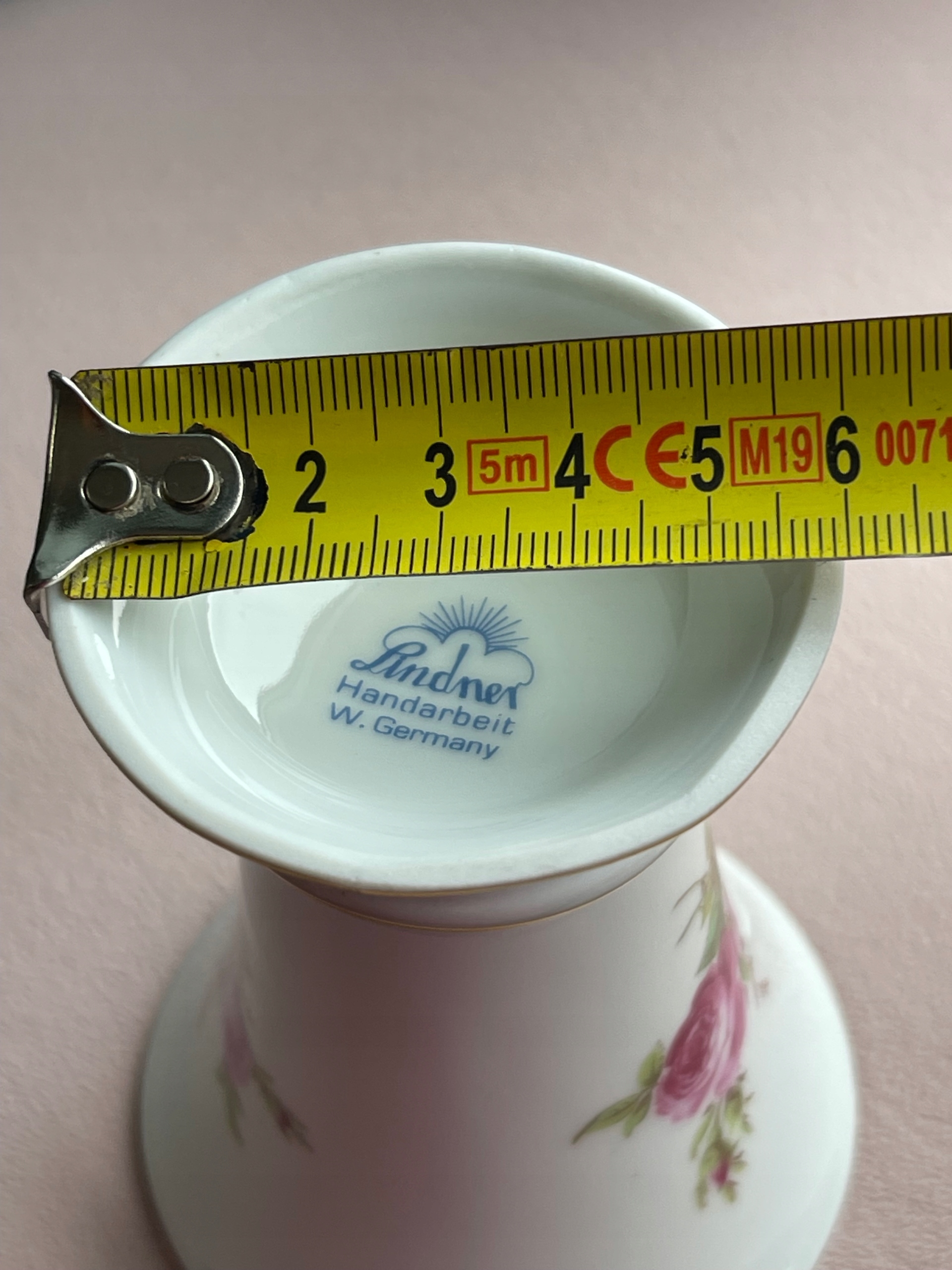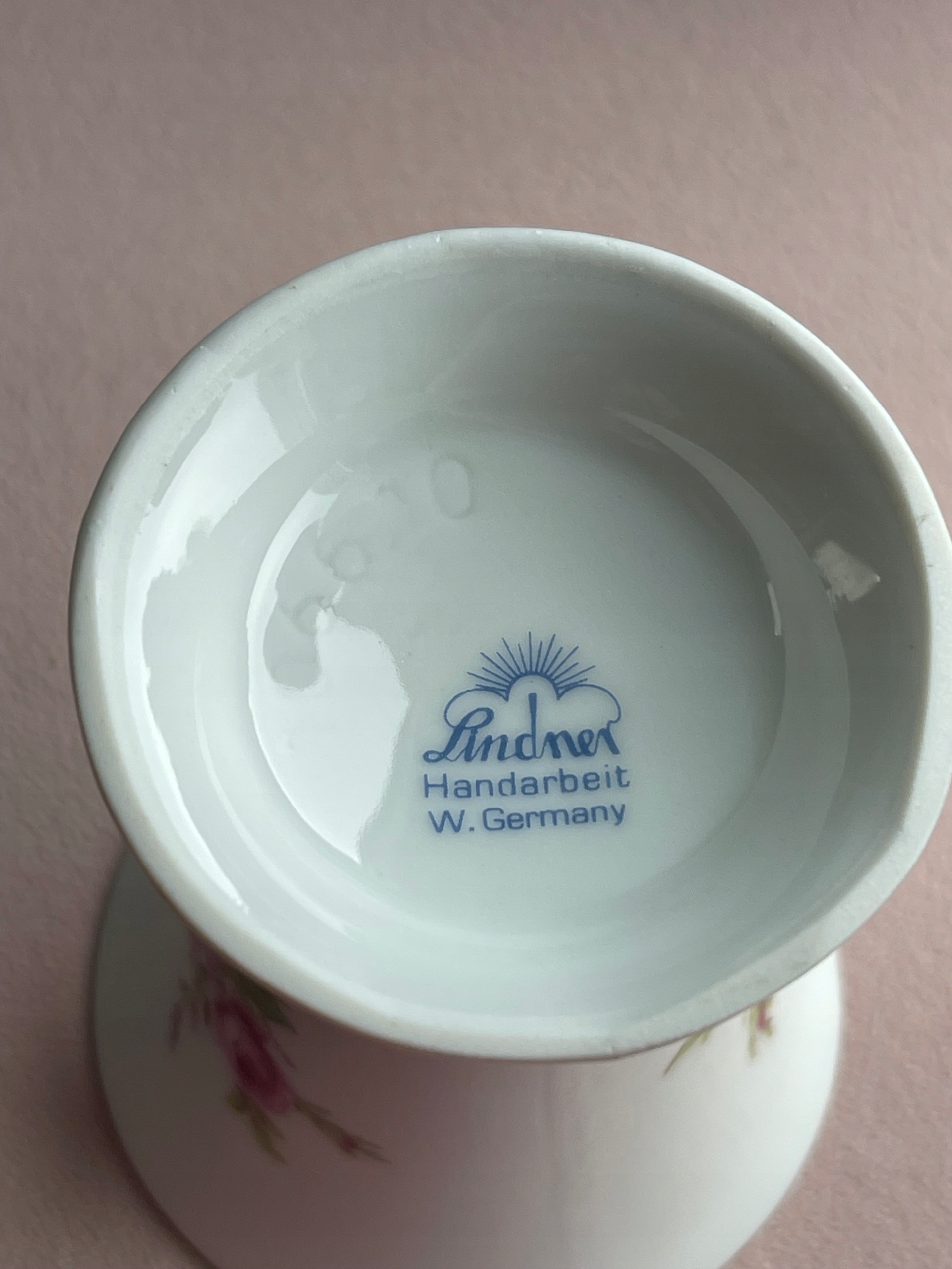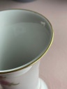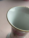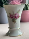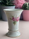 Wazon zdobi ponadczasowy motyw róż oraz subtelne złocenia na krawędziach, które dodają mu elegancji i stylu. Sygnatura na spodzie ("Handarbeit") potwierdza tradycyjne, rzemieślnicze wykonanie przedmiotu w Zachodnich Niemczech.