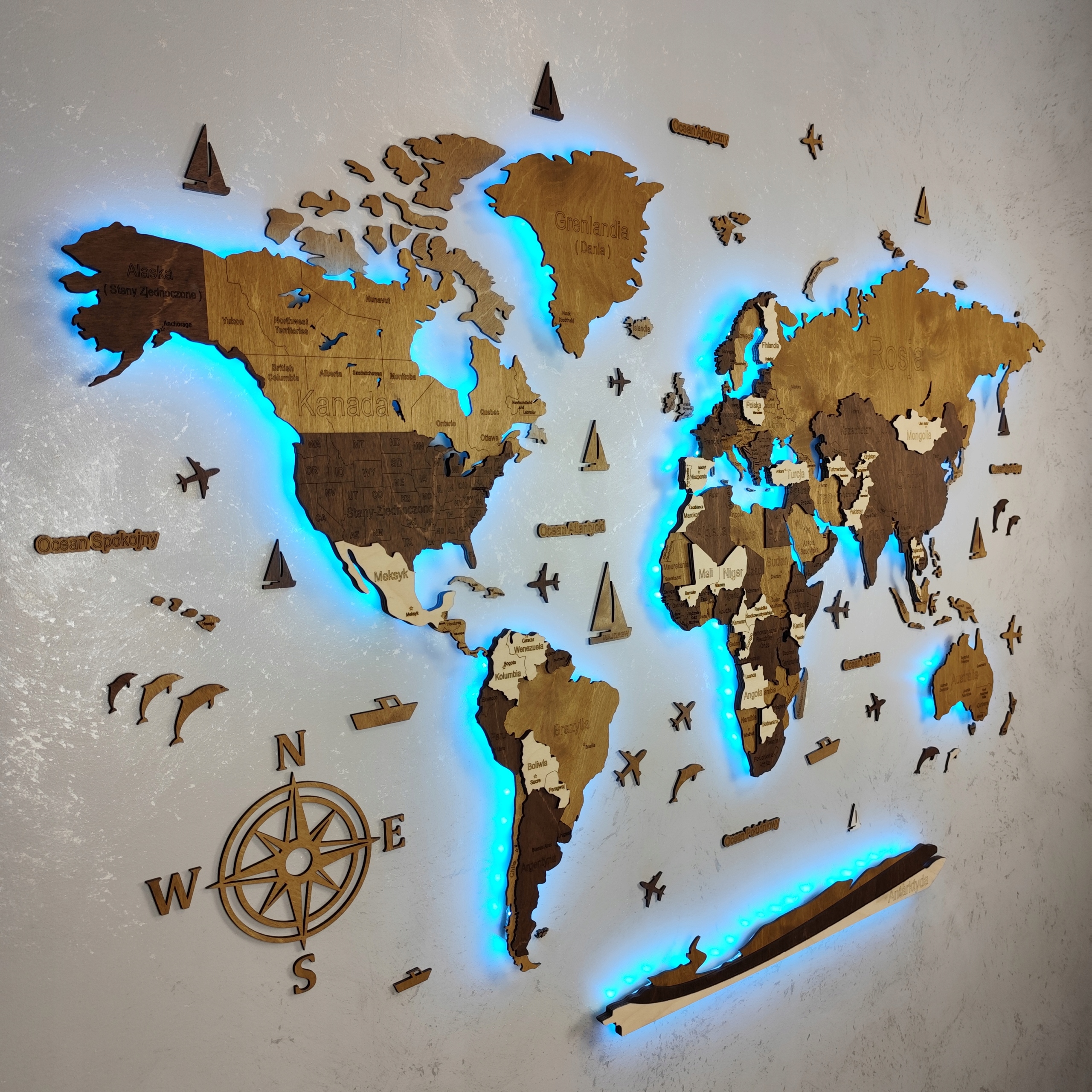 ✔️ Drewniana mapa świata 3D LED (w częściach)