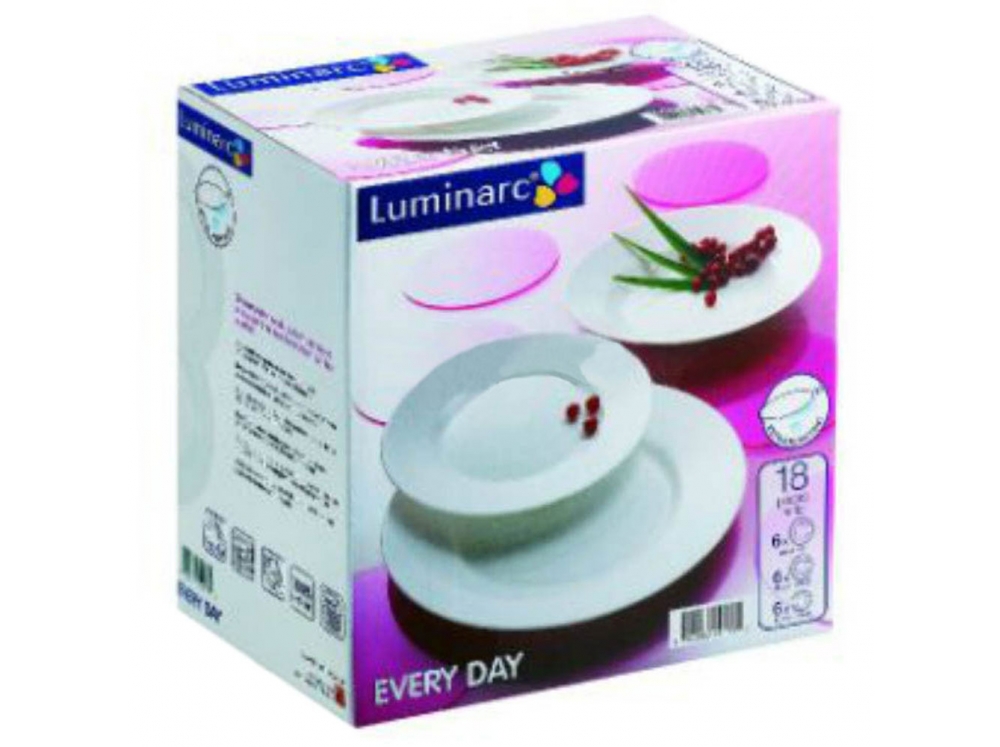 Komplet obiadowy 18-elementowy Every Day - zastawa stołowa wykonana z białego szkła hartowanego, które poddawane jest specyficznej obróbce termicznej w celu zagwarantowania lepszej jakości i wytrzymałości na wstrząsy i uderzenia. Szkło jest materiałem nieporowatym, dlatego nie zatrzymuje żadnych mikroorganizmów, jest 100% higieniczne.