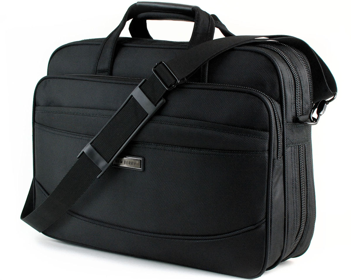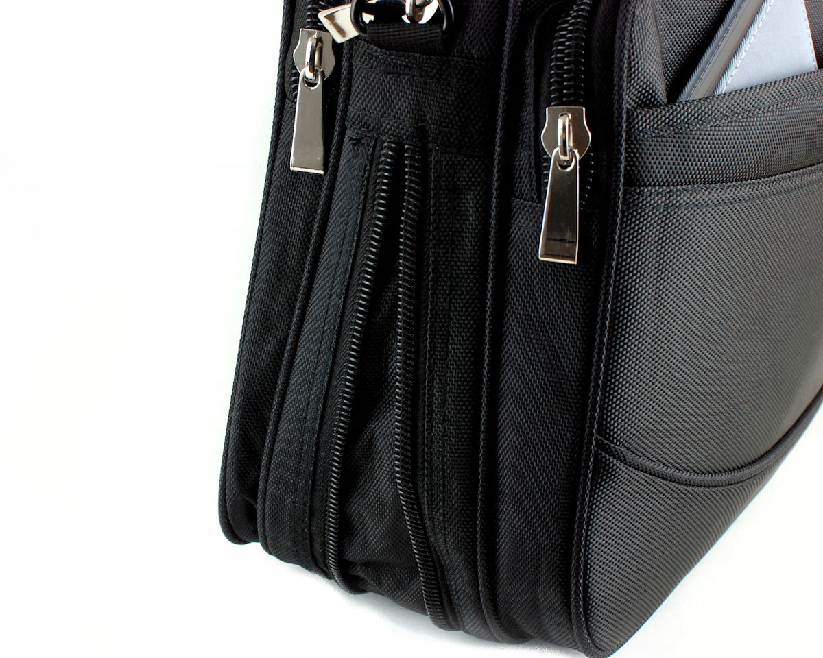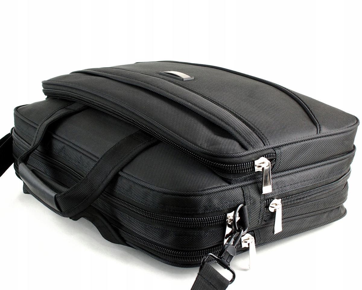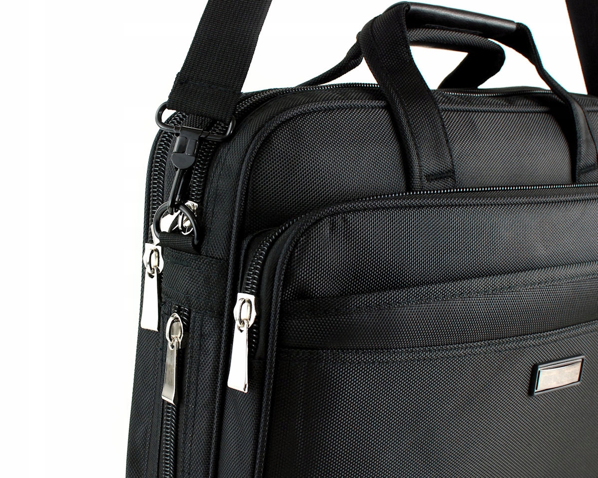 Torba w klasycznym wzorze pasująca do eleganckich jak również do codziennych ubiorów. Doskonała do przenoszenia dokumentów, elektroniki użytkowej, rzeczy codziennego użytku. Wykonana z tkaniny poliestrowej wzmocniona od spodu powłoką poliuretanową. Wewnątrz wykończona podszewką oraz usztywniona elastyczną pianką. Posiada 14 różnych kieszeni w tym 8 na suwak. Największa komora o wymiarach 30 x 40 x 5-9 cm w niej przegroda z mocowaniem na rzep 28 x 37 x 4 cm . W tylnej części kieszeń 30 x 40 x 3 cm na dokumenty, prasę oraz mniejsza zamykana na zamek. W przedzie miejsce na długopisy, telefon itp. Na zewnątrz z tyłu ukryta kieszeń z suwakiem obok mocowanie do walizek podróżnych. Torba posiada uchwyty do noszenia w ręku oraz regulowany odpinany pasek z podkładką na ramię o maksymalnej długości 125 cm.
