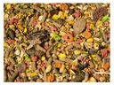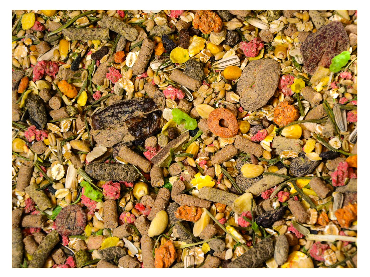 SKŁAD: pszenica, jęczmień, owies, płatki musli , słonecznik czarny, siemię lniane, słonecznik biały, kukurydza gnieciona i ziarno kukurydzy, ryż ekstrudowany, ekstrudery pszeniczne, zioła (łodyga pietruszki, selera i lubczyku), marchew, burak, jabłko, rodzynki oraz inne warzywa i owoce sezonowe