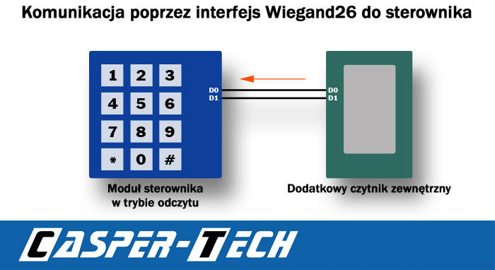 Модуль имеет разъем интерфейса Wiegand-26 (12V, GND, D0, D1). Например, вы можете модуля подключить дополнительный считыватель RFID и через чтение ключей через второй читатель управлять контроллером. Не имеет возможности передачи данных. Модуль работает только как приемник.