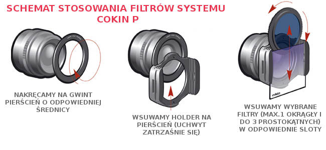 Pierścień umożliwia zamontowanie uchwytu Cokin typu P do obiektywów i tulejek z gwintem o średnicy 49mm. Dopasowując odpowiedni adapter cały system Cokin można zamontować na każdym obiektywie o średnicy gwintu od 49mm do 86mm. Przy zmianie obiektywu nie musisz zatem zmieniać filtrów, wystarczy, że założysz odpowiedni adapter.