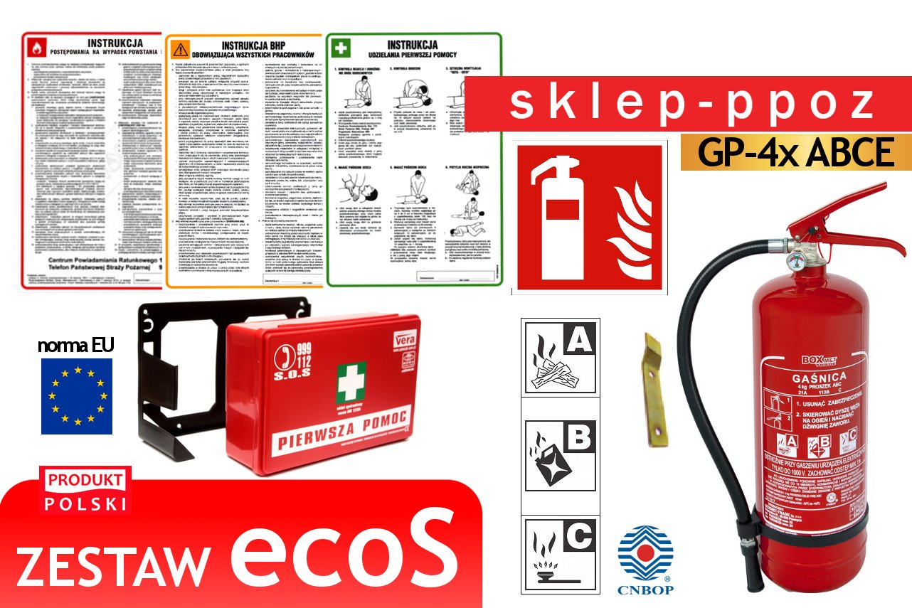 ZESTAW ecoS - wersja ekonomiczna znanego już zestawu S - wielkość gaśnicy (4kg środka gaśniczego) w zestawie dobrana jest do małych i średnich biur, lokali o powierzchni<=200m2. zestaw został wyposażony w apteczkę k1 przeznaczoną do udzielania pierwszej pomocy (skład apteczki zgodny z normą din 13164). zestawie znajdziecie państwo również niezbędne oznakowanie gaśnicy oraz podstawowe instrukcje: wypadek pożaru,udzielania obowiązująca wszystkich p>