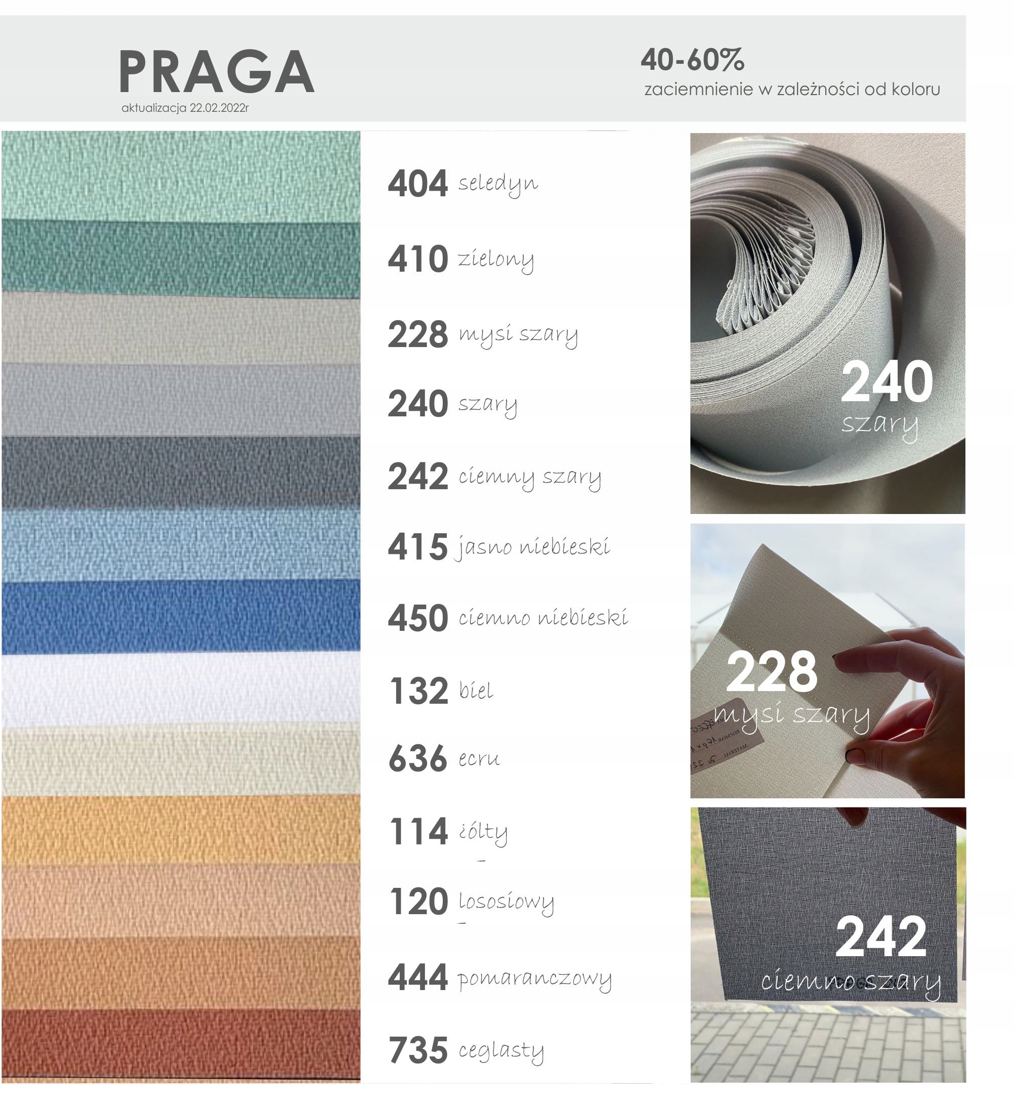 Zdjęcia kolorów widoczne na aukcji mogą różnić się od faktycznych kolorów tkanin z kolornika. Może to być spowodowane indywidualnymi ustawieniami monitora, ekranu w telefonie oraz światła podczas zdjęć wzorników. Zamów bezpłatne próbki tkanin do domu lub poproś o dokładniejsze zdjęcia.