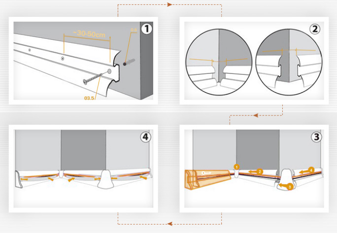 Наши молдинги благодаря гибким краям, изготовленным из силиконовых резинок, отлично маскируют неровности пола и стены. Это быстроразъемная планка со съемным центром, местом для электрические провода и RTV.