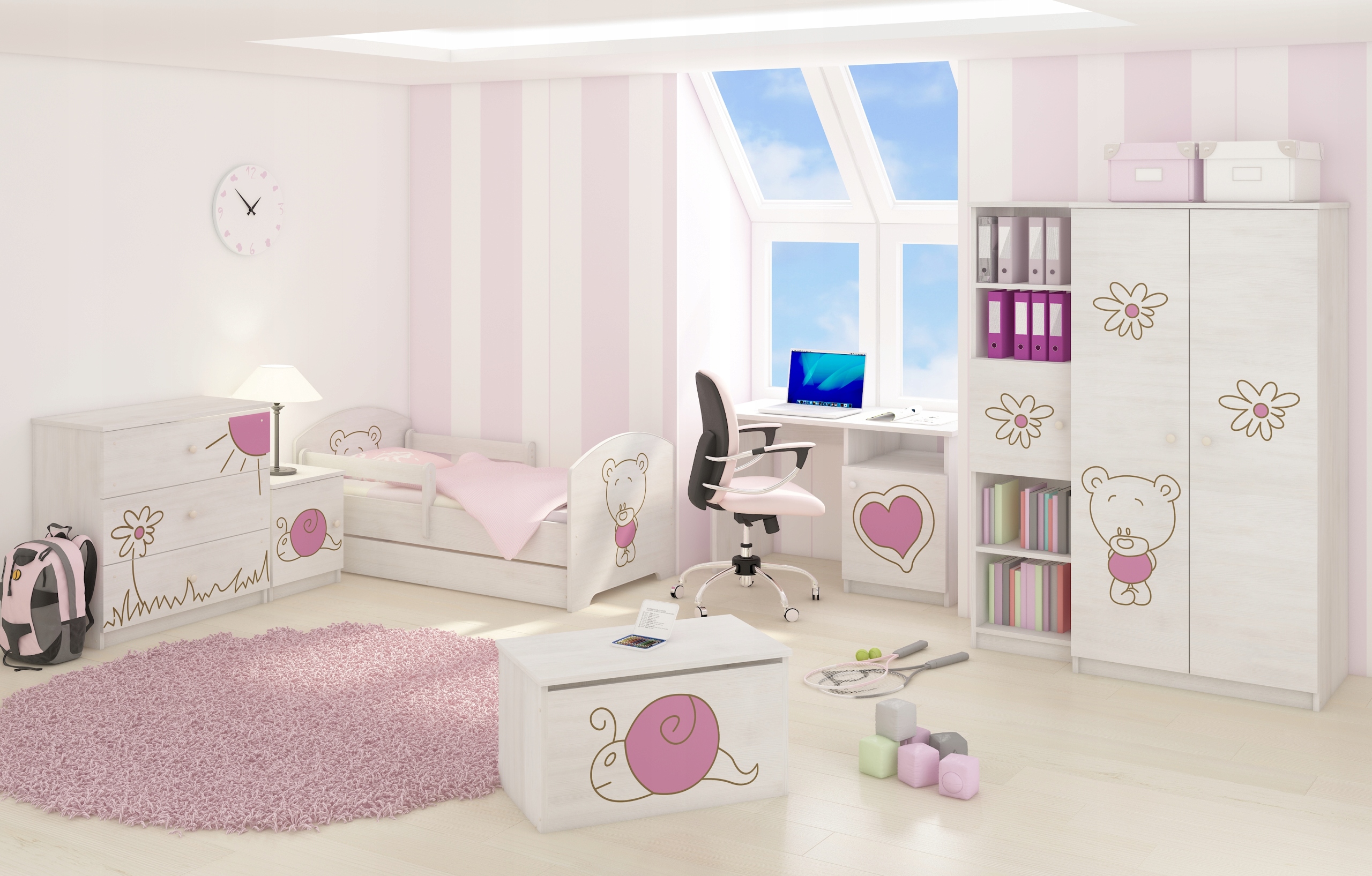 Łóżko posiada dwie barierki zabezpieczające dziecko przed upadkiem podczas snu, są one na uchwytach, co pozwala je dowolnie zamieniać stronami. Każdy element łóżka jest zaokrąglony, tak aby zapewnić dziecku maksymalne bezpieczeństwo, unikamy ostrych i niebezpiecznych krawędzi. W zestawie dodatkowo znajduje się funkcjonalna szuflada wsuwana pod łózko.