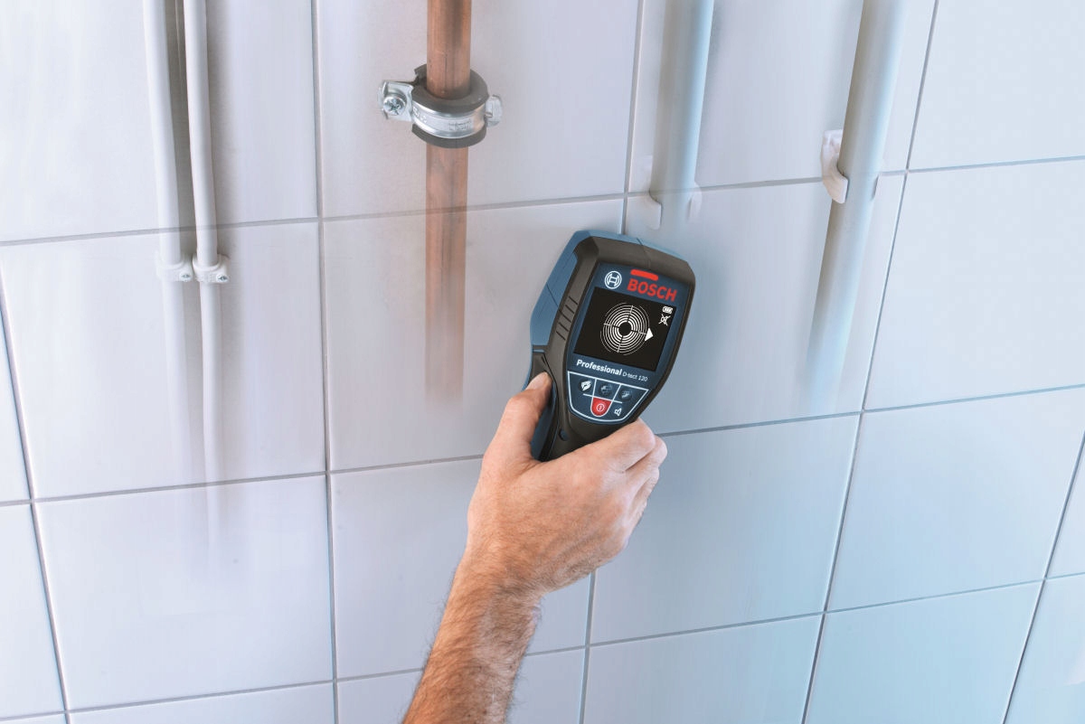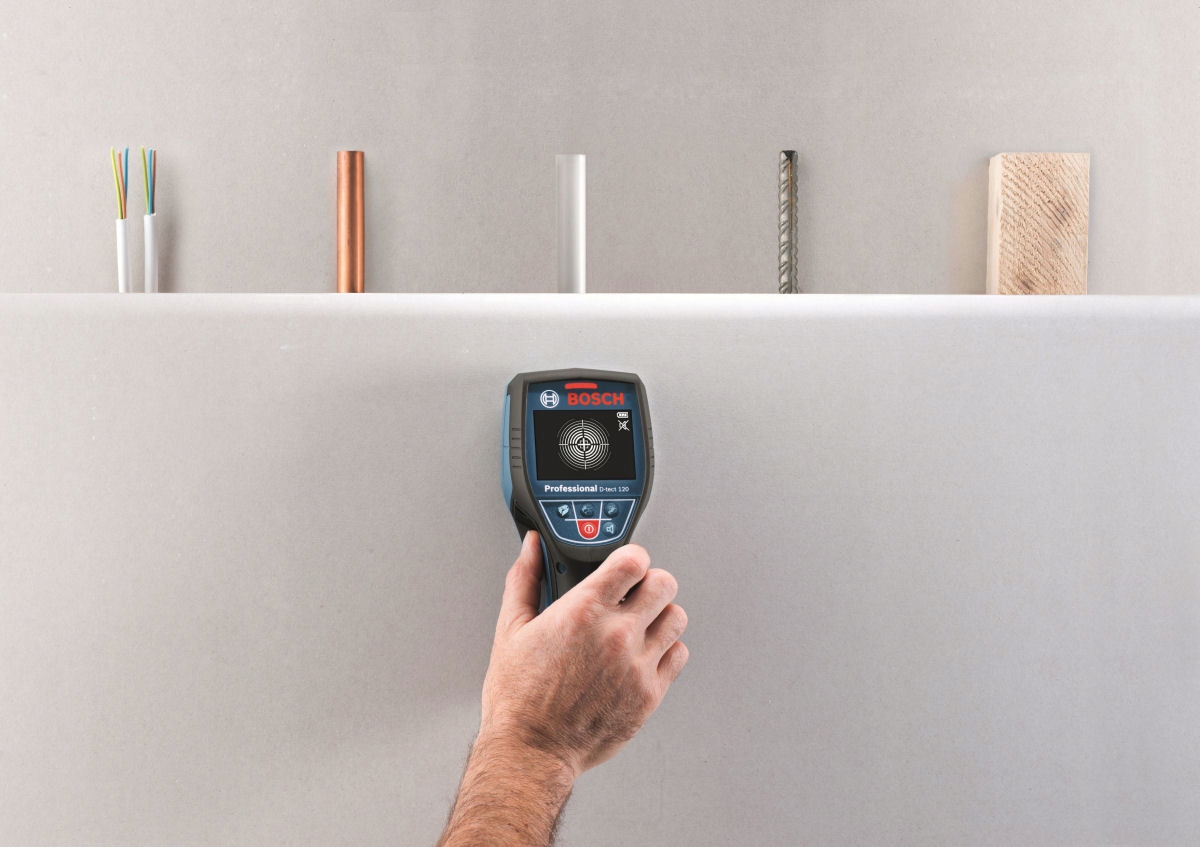 Цифровой универсальный детектор D-TECT 120 от BOSCH используется для обнаружения стены водопроводных труб из пластика, черных и цветных металлов, конструкции деревянные, электрические провода и другие кабели.