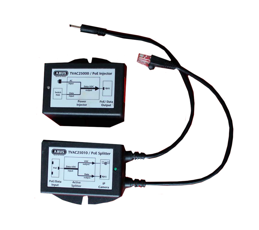 Może być stosowany z odbiornikiem (splitterem) TVAC25010 firmy ABUS dla podłączenia kamer, które nie wykorzystują zasilania 48V PoE tylko mają osobne zasilanie na 12V. Splitter przekształca napięcie strumiennicy 48V na 12V, zasila kamerę oraz przesyła dane z kamery do transmitera.