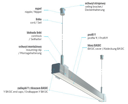 Instrukcja montażu profilu Y z kloszem BASIC za pomocą (1) taśmy dwustronnej, (2) uchwytu montażowego Y, (3) profilu pomocniczego Y M1 oraz uchwytu metalowego Y