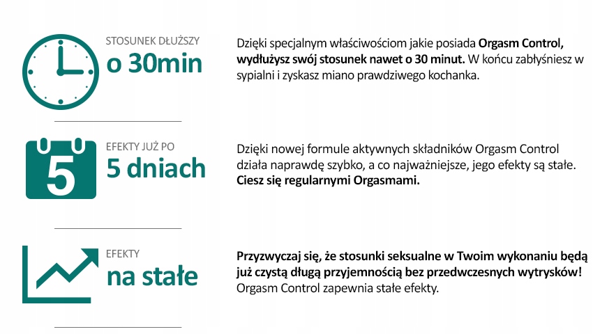 Oto sposób na pełną satysfakcję z życia seksualnego – Orgasm Control. To linia sprawdzonych produktów przedłużających stosunek nawet do 30 minut. Nie przejmuj się już niepowodzeniem w łóżku i wspinaj się na wyżyny seksualnych doznań. Tabletki Orgasm Control stanowią podstawę kuracji, dzięki której Twoja erekcją utrzyma się o wiele dłużej bez przedwczesnego wytrysku. Nie będziesz musiał się już obawiać o to, że Twój stosunek potrwa maksymalnie 5 minut. A jedyne co będziesz musiał zrobić to codziennie rano połknąć 1-2 tabletki.
