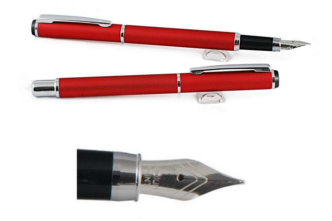 Pióro o najbardziej lubianym prostym kształcie. Stalówka klasyczna, zdobiona, stalowa średniej najpopularniejszej grubości. Uchwyt przy stalówce z tworzywa. Korpus, nasadka, pierścienie i klip są metalowe. Lakier na korpusie matowy w kolorze czerwonym. Wykończenia w kolorze srebrnym.