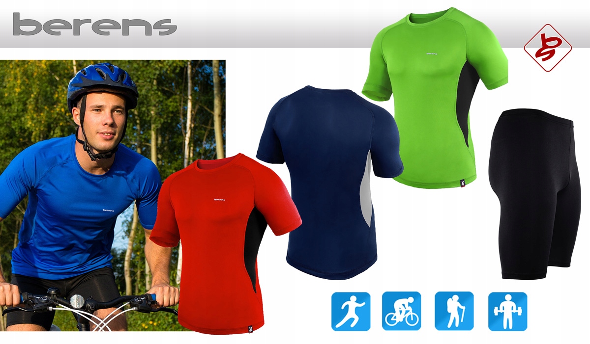 Koszulka termoaktywna oraz krótkie spodenki termoaktywne BERENS Powerelastic to niezwykle funkcjonalna i wygodna w noszeniu propozycja dla wszystkich uprawiających sport, zwłaszcza do rekreacyjnej jazdy na rowerze, biegania, joggingu oraz wszelkich aktywności fitness - zarówno na powietrzu, jak i na sali. Polecamy wszystkim, którzy nie lubią jeździć w spodenkach z wkładką rowerową.