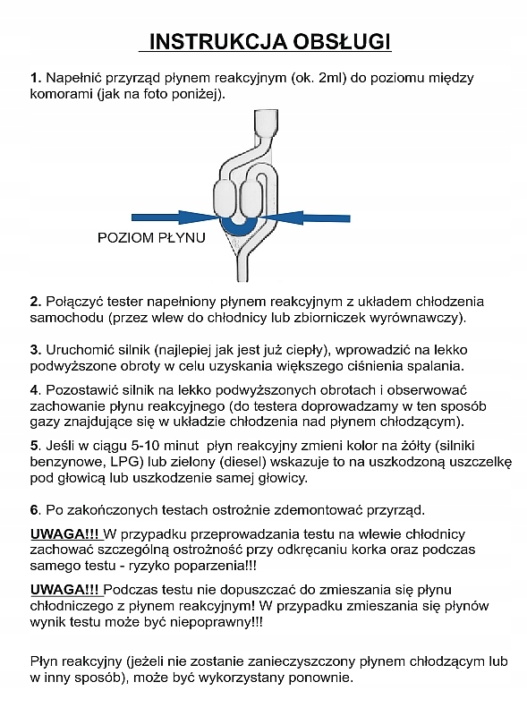 Тестер используется для обнаружения повреждений прокладки головки и головки в двигателях выхлопных газов (бензин, дизель, сжиженный газ) с жидкостным охлаждением. Тестер имеет тот же принцип работы, что и тестеры по ценам 250-500 зл предлагаются на Allegro.
