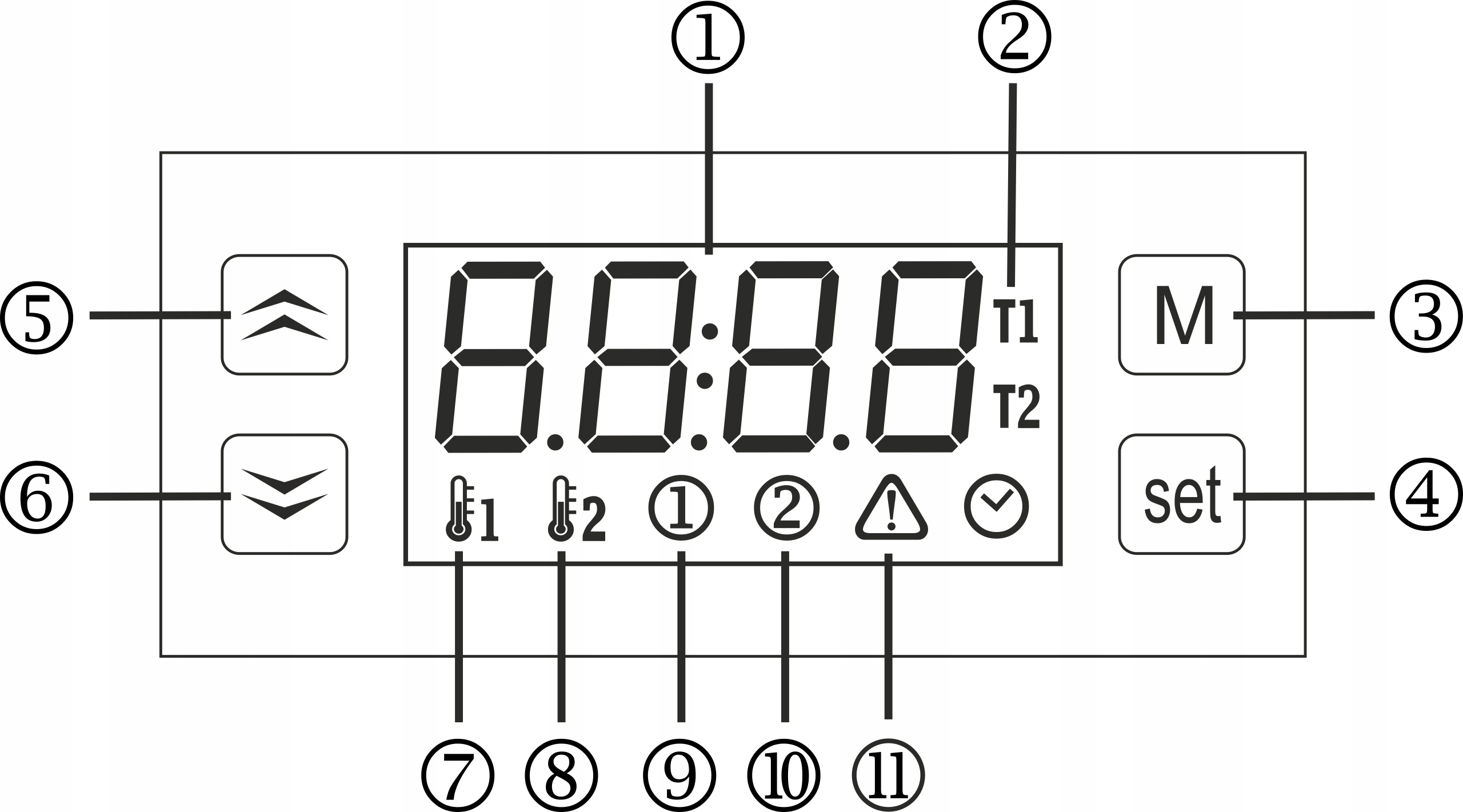 Регулятор имеет цифровое считывание температура и функция калибровки индикации. Значение датчика T1 и T2 отображается на чередуйте каждые 3 секунды. Можно настроить так, чтобы регулятор отображал только один показание.