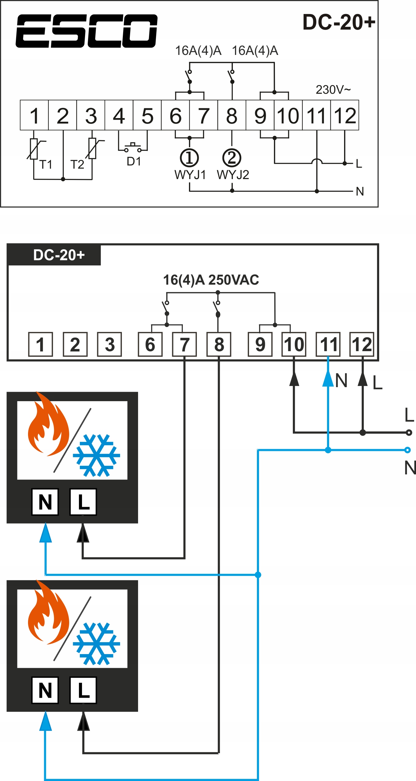 DC-20 аббревиатура "double controller" - это де-факто два регулятора температуры, расположенных в одном корпус с возможностью произвольной конфигурации входов-выходов и привязки обоих регуляторов. Устройство он имеет 2 входа и 2 управляющих выхода, которые могут работать в режиме нагрева или Охлаждение, и измерение измеряется с датчика T1 или T2, или с обоих датчиков одновременно.