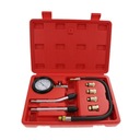 Tester do kontroli ciśnienia sprężania w cylindrach silników benzynowych z wyposażeniem poszerzającym jego możliwości. W walizce plastikowej znajduje się manometr z zaworem, przedłużka prosta i zagięta, przedłużający wąż ciśnieniowy oraz 4 adaptery do podłączenia do cylindrów. Części są wyposażone w szybkozłącza do łatwego i szybkiego zamontowania.