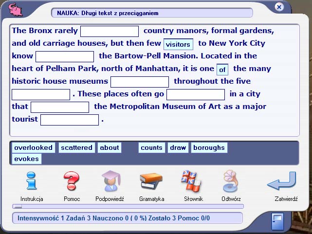 Podobnie jak jego poprzednie wersje jest to program o charakterze ćwiczeniowo-testowym. Nie stanowi więc systematycznego kursu językowego w postaci kolejnych lekcji, lecz zawiera bardzo bogaty zbiór ćwiczeń i testów na wszystkich poziomach zaawansowania od początkującego do Proficiency, które bardzo skutecznie wspomagają i uatrakcyjniają naukę języka angielskiego w szkole, na kursie językowym, czy na studiach. Może też stanowić pożyteczną pomoc dla samouka. Jest również nieocenioną pomocą w przygotowaniu do różnych egzaminów (Matura, FCE, Proficiency itp.). Program zawiera też słowniczek i podręcznik gramatyki angielskiej.