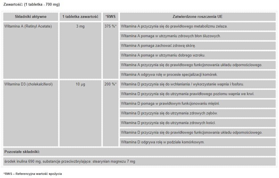 Witamina A – należy do grupy witamin dobrze rozpuszczalnych w tłuszczach. Pełni szereg ważnych funkcji w organiźmie m.in bierze udział w syntezie białek, wspomaga układ odpornościowy, chroni organizm przed infekcjami, ma pozytywny wpływ na jakość widzenia.