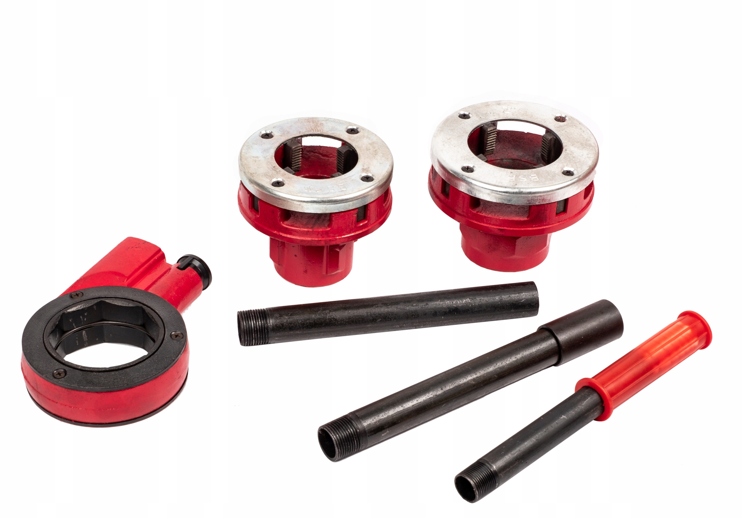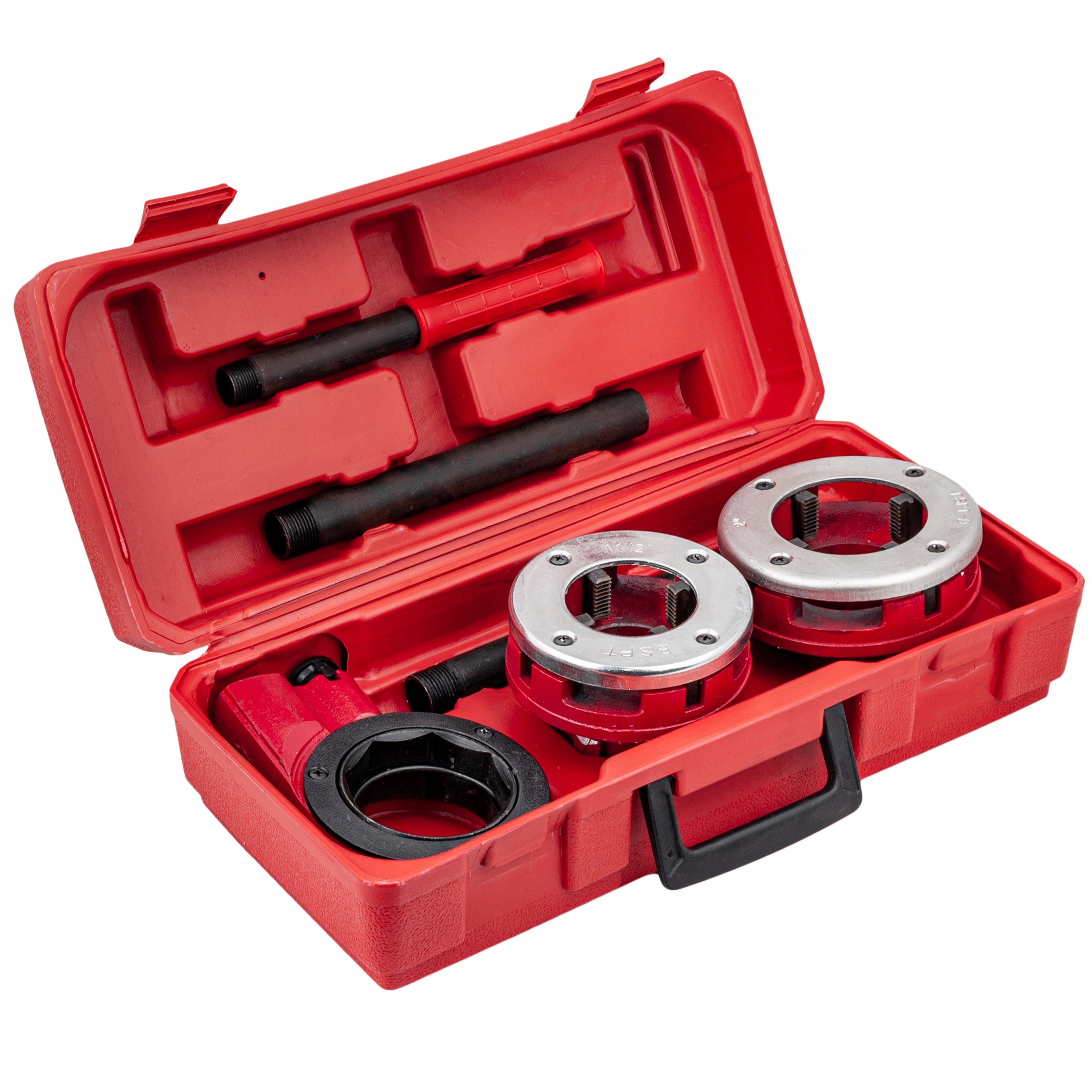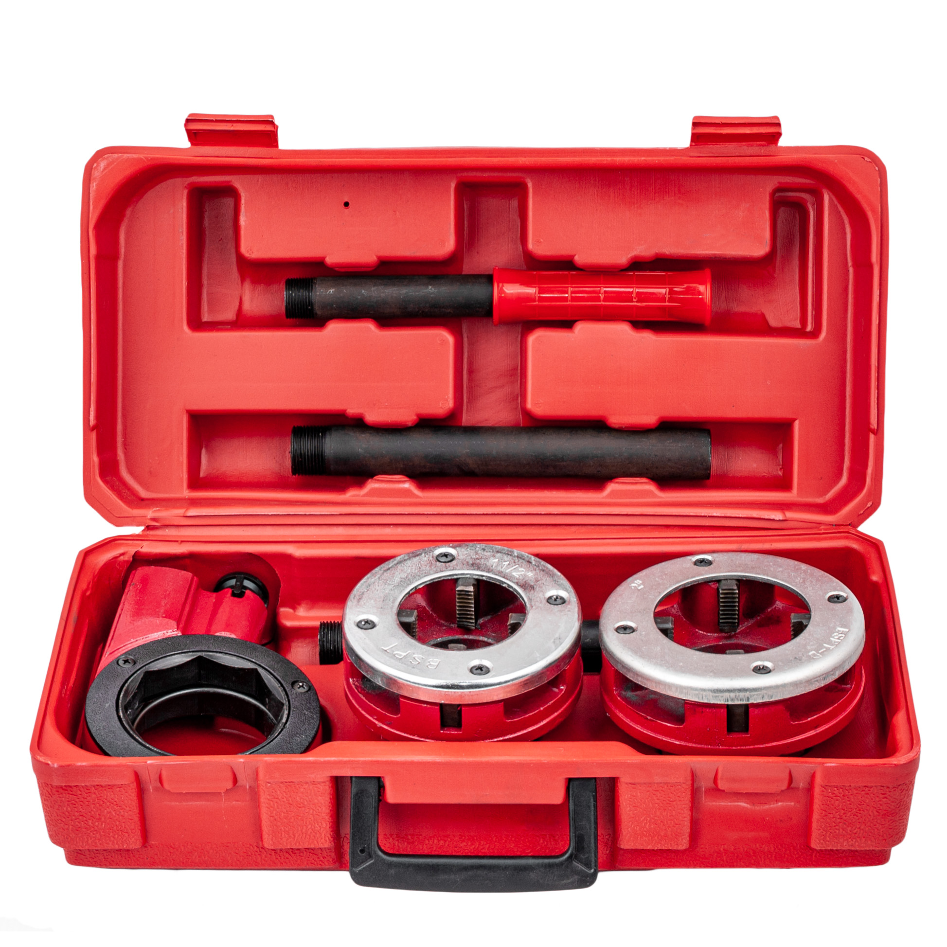 Комплект в удобном чемодане-для удобства транспортировки и хранения. Это устройство используется для нарезания резьбы по трубам и фитингам. Он будет использоваться как во время ремонта как и на стройке. Имеет храповик для крепления плашек. Новый, неиспользованный, упакованный производитель.