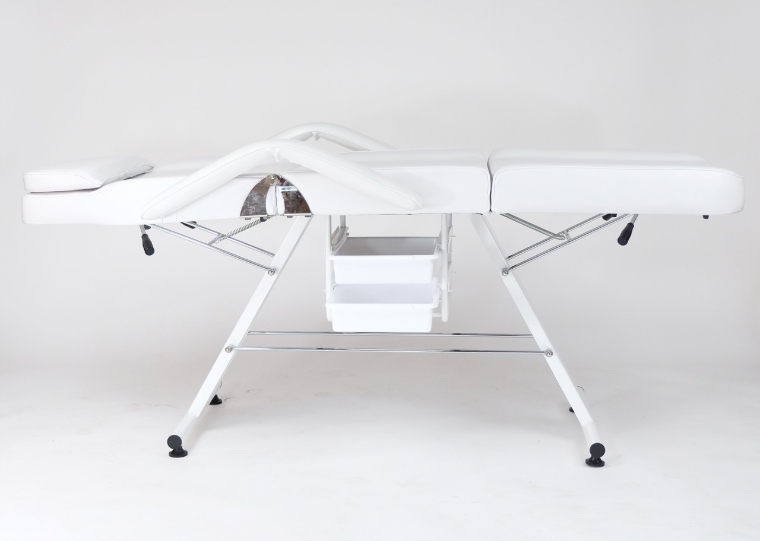 Fotel kosmetyczny usytuowany na stabilnej podstawie, która posiada zamontowane dwie wysuwane kuwety.
