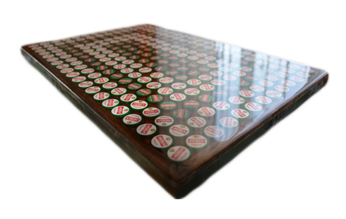 4. Так, приготовленный столешница после высыхания морилки подходит для укладки крышек. В случае затопления более тяжелых элементов сразу после их укладки на поверхность столешницы, можно их заливка смолой, не боясь, что всплывет. К сожалению, в для бутылок, которые, во-первых легкий, во-вторых, после укладки создается под ними подушка подушка безопасности, и могут всплыть необходимо выполнение первого этапа, т. е. приклеивания крышек на поверхности столешницы. В нашем случае это было сделано через излияние на столешницу смолы Кристаллический 940 о толщина около 2мм, а затем и настоящие шапки, смола в данном случае сработала как клей и przymocuje их к основанию.