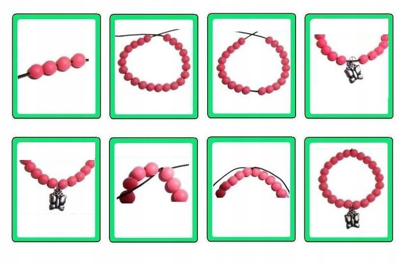 Wykonanie bransoletek jest niezwykle proste, wystarczy nawlec koraliki na gumkę a następnie zawiązać obydwa końce gumki. Modne obecnie zawieszki charms montujemy za pomocą ogniwek.