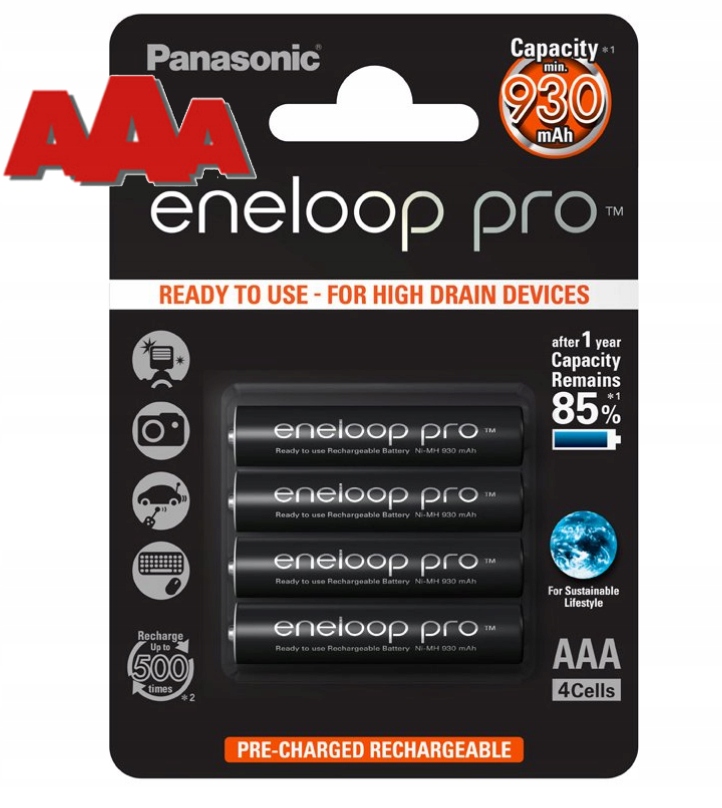 Аккумуляторные батареи eneloop pro идеально подходят для использования в устройствах с высоким энергопотреблением, такие как камеры, вспышки, беспроводные клавиатуры и мыши, игры, бытовая техника, радиоприемники и многое другое. Аккумуляторы марки eneloop полностью заряжены в момент и батареи Eneloop pro заряжаются для этого намного быстрее.