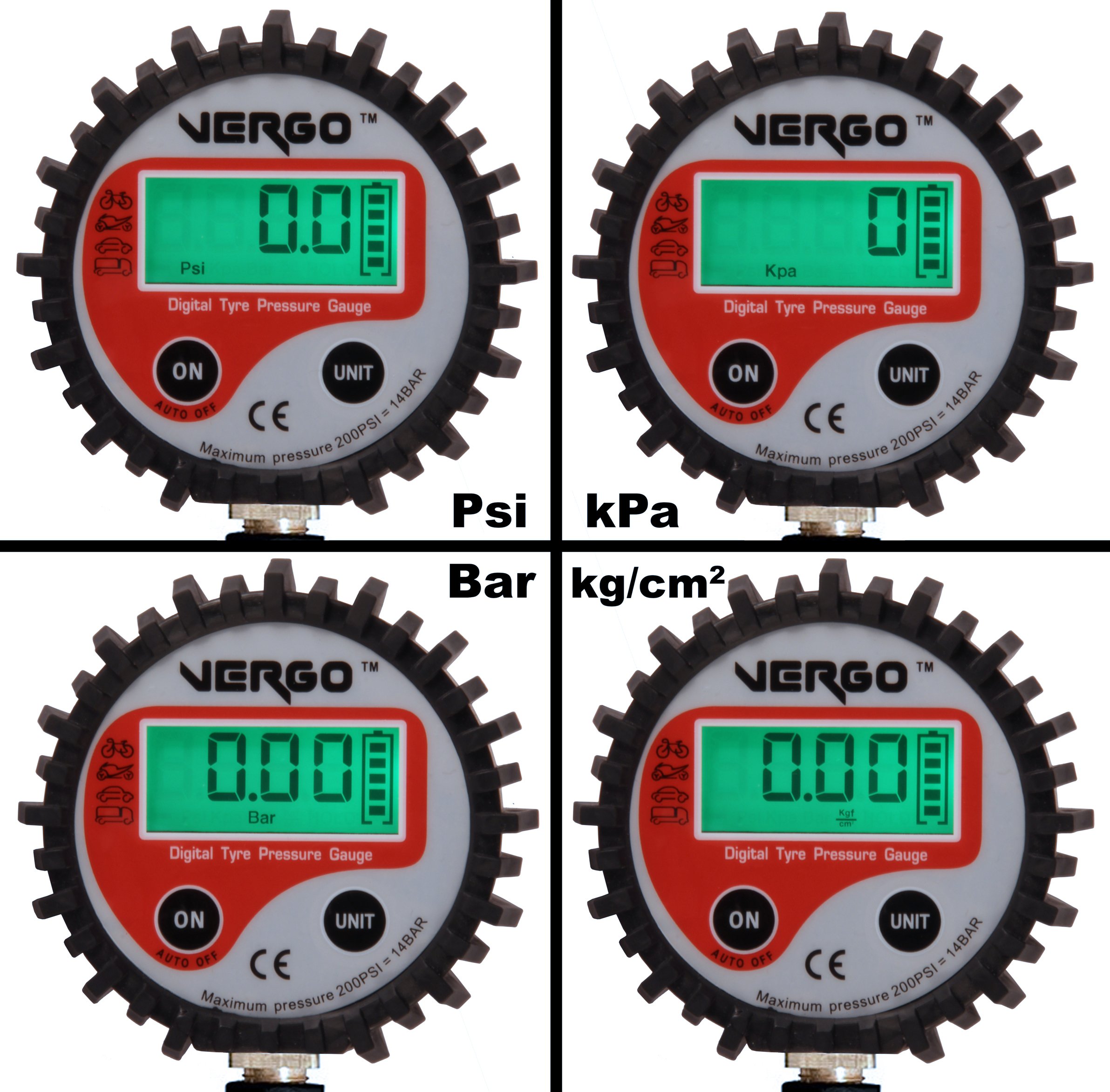 Wystarczy nacisnąć przycisk "UNIT", by zmienić jednostkę pomiarową między psi, kPa, bar lub kg/cm^2.