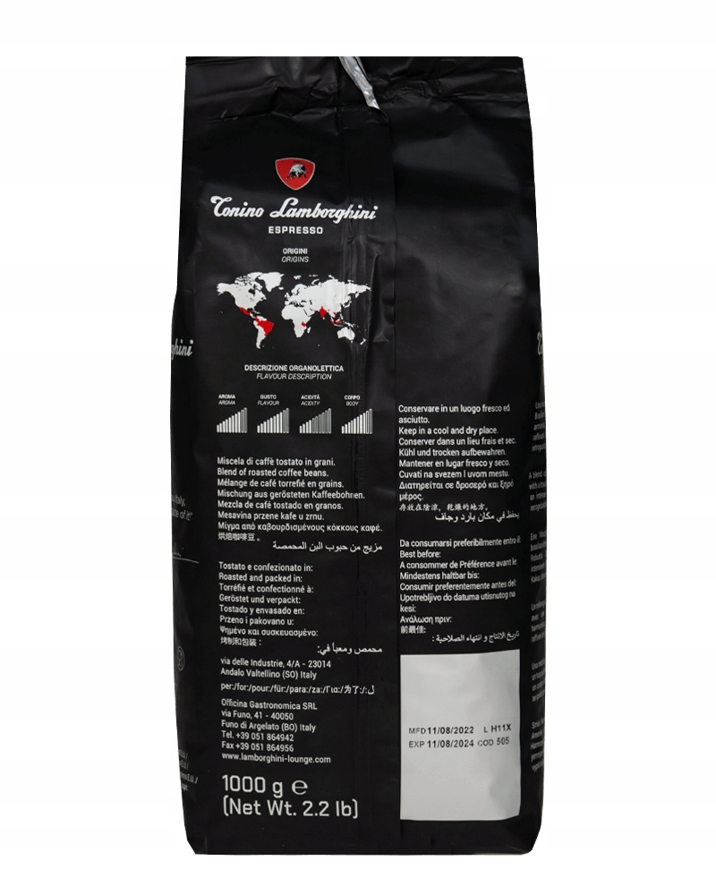 Sama kawa sygnowana charakterystycznym logo byka jest unikalnym i doskonałym połączeniem pasji oraz wieloletniej tradycji palenia klasycznego, włoskiego espresso z nowoczesną technologią procesu doboru, prażenia i pakowania wyjątkowych kawowych kompozycji. Staranne procedury oraz ścisła kontrola całego procesu produkcji gwarantują zawsze tą samą, najwyższą jakość w każdej filiżance kawy zaparzonej na bazie ziaren Tonino Lamborghini.
