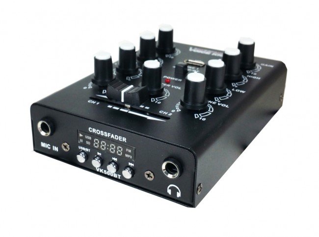 Czarny 2-kanałowy mikser dla DJów z portem USB i funkcją bluetooth oraz wejściami typu cinch i jack.