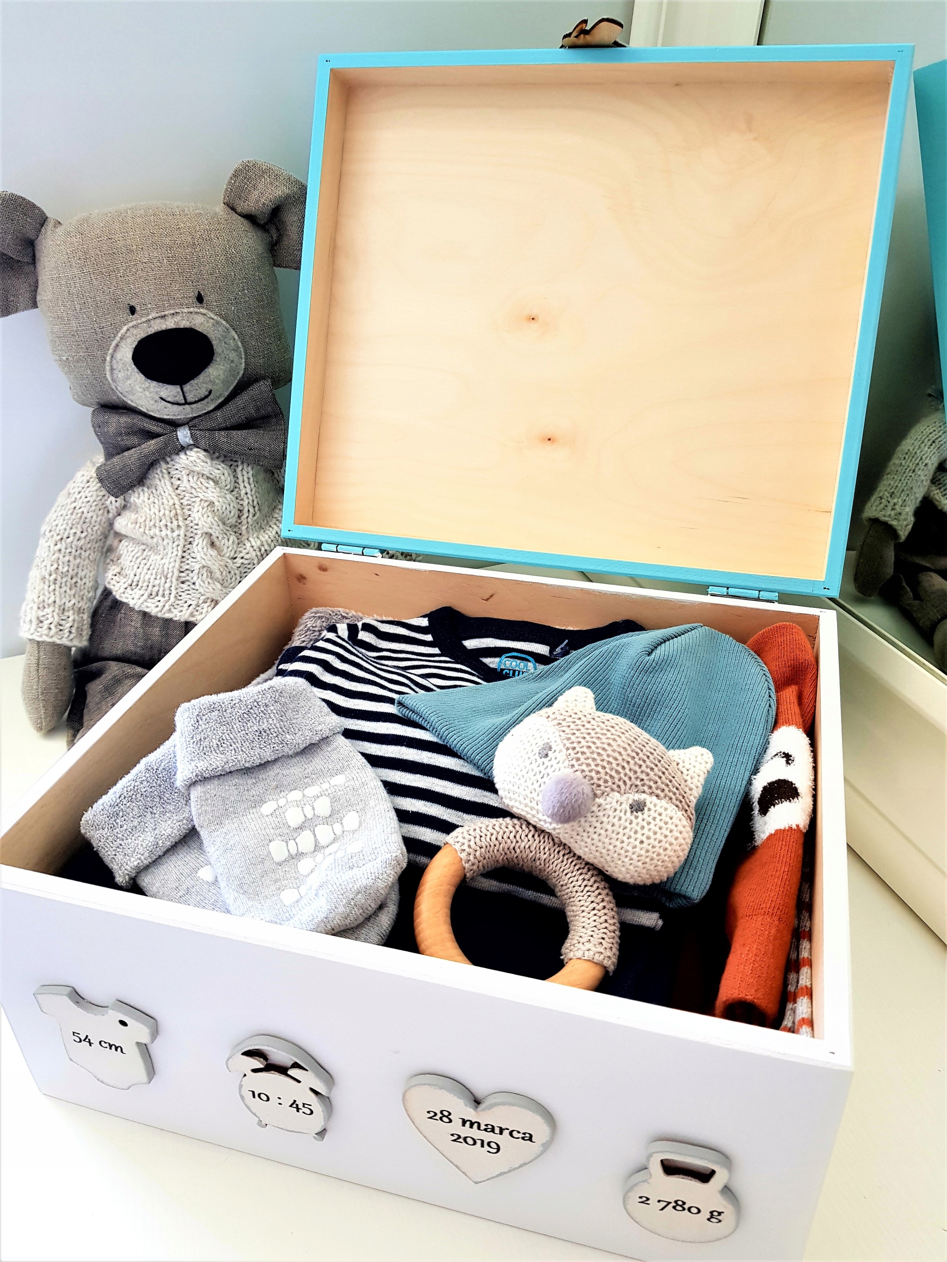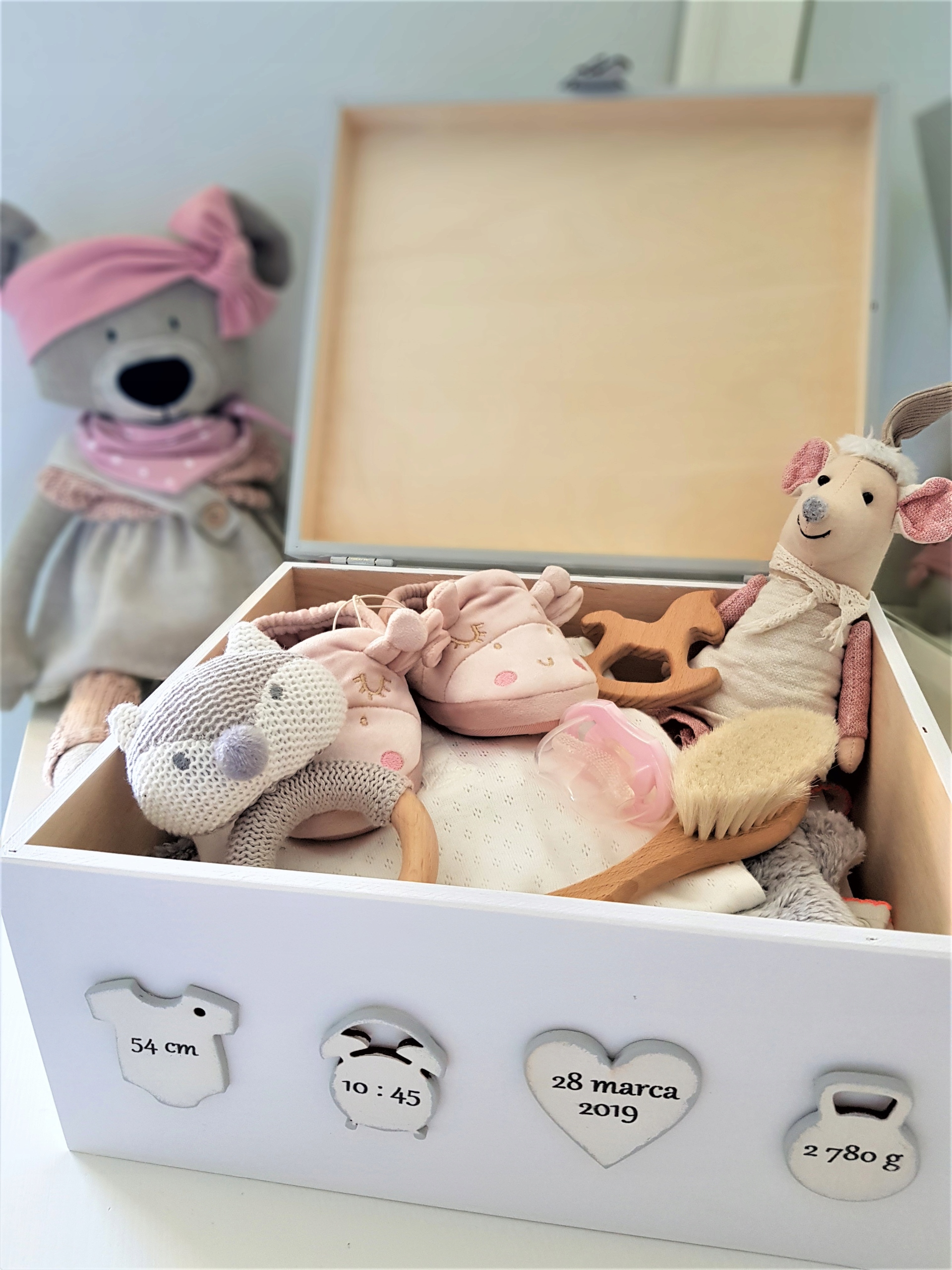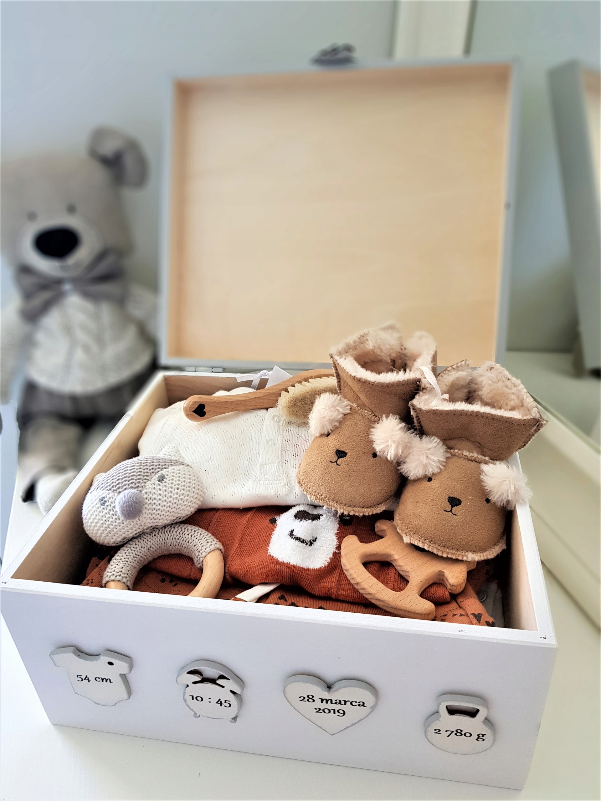 Zamieszczone na zdjęciach w pudełku gadżety (np. skarpetki, śliniak, smoczek, ubranka, buty) nie są na sprzedaż są jedynie przykładem zawartości pudełka.