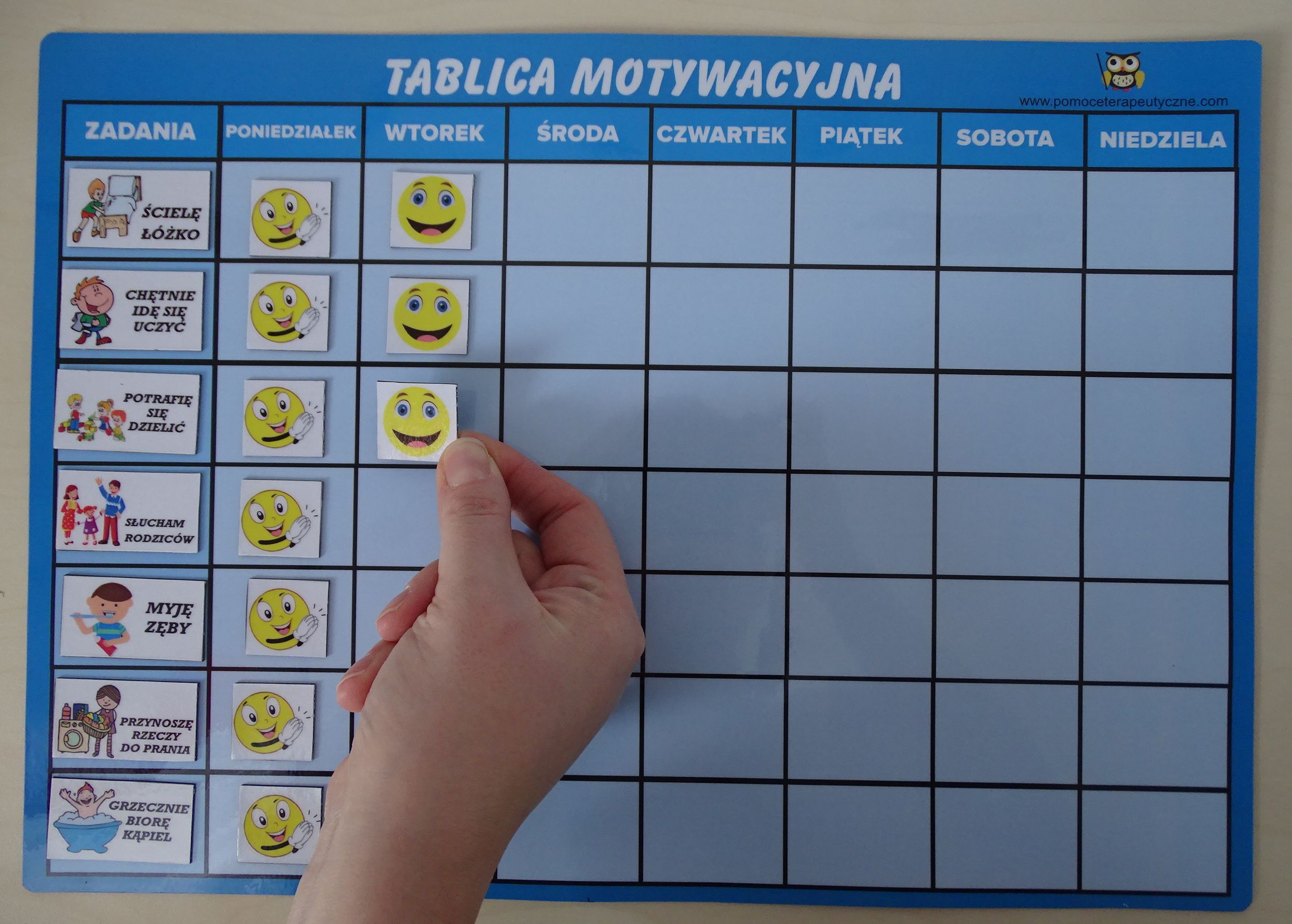 Aby wzmocnić pozytywne zachowania, możemy zastosować strategię nagród pod koniec dnia oraz tygodnia, gdy cała tablica będzie zapełniona znaczkami, nagrodą może być wyjście na basen, wspólny wyjazd, coś co sprawia dziecku satysfakcję.
