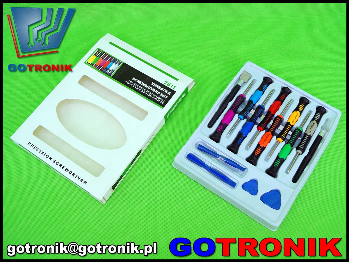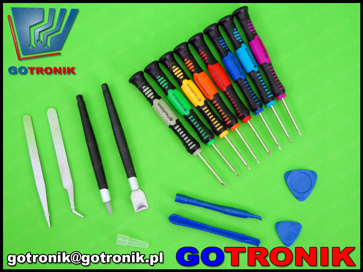 Zestaw narzędzi serwisowych składający się z 16 elementów mający zastosowanie przy naprawach przenośnych urządzeń typu smartfony, tablety, telefony komórkowe GSM itp. W zestawie odnajdziemy najpopularniejsze typy wkrętaków typu T3, T5, T6, gwiazdka * 0,8 i 1,5, oraz wkrętaki krzyżakowe 1,2 i 1,8 i płaski 1,8. Do dyspozycji mamy także narzędzie do podważania: dwie kostki małą i dużą, a także dwa proste otwieraki. Dodatkowo zestaw wyposażono w łopatkę do rozprowadzania topnika i nóż z wymiennymi końcówkami. Zestaw idealnie nadaje się do serwisu jak i na prezent dla początkującego elektronika.