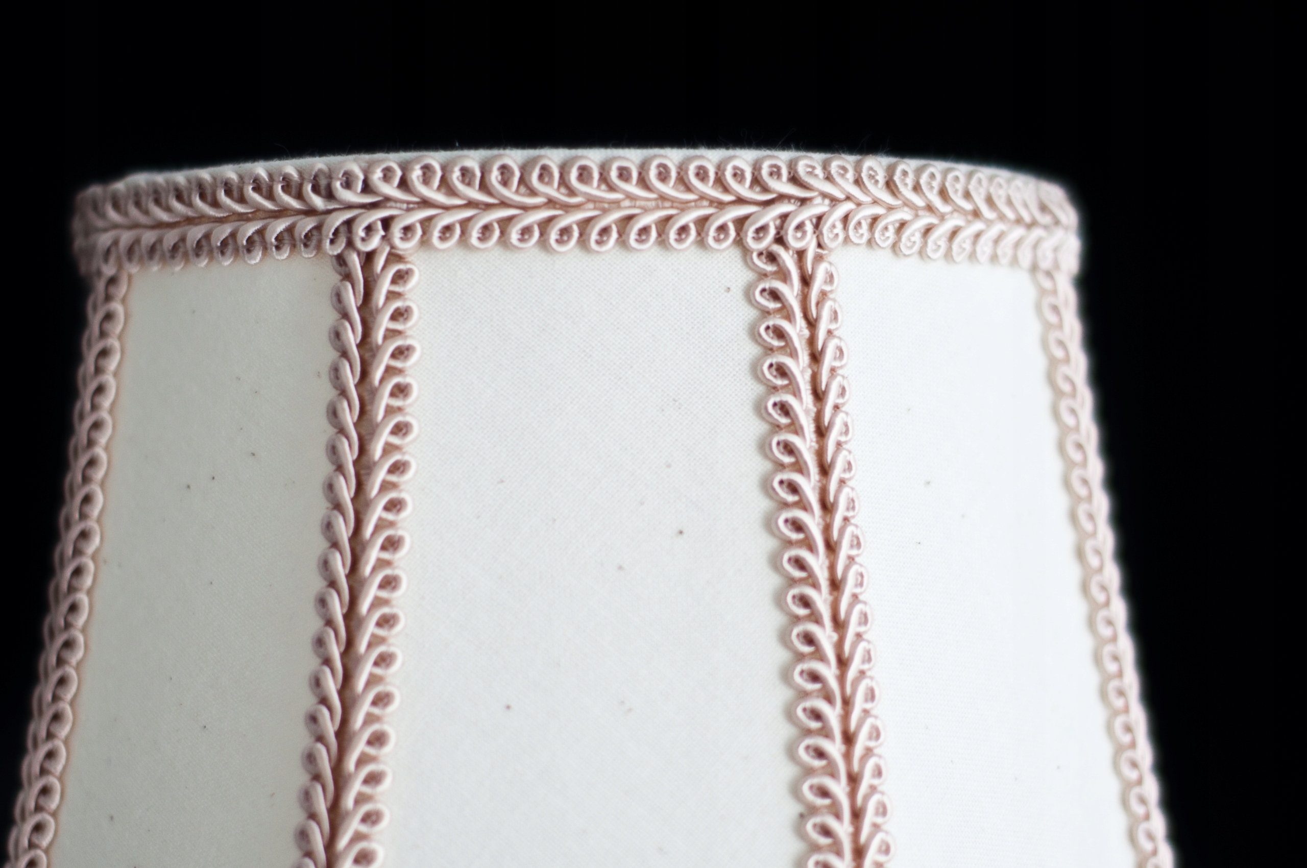 Абажур из коллекции натуральных тканей, изготовленный из экологически чистой льняной или хлопчатобумажной ткани украшен лентой.