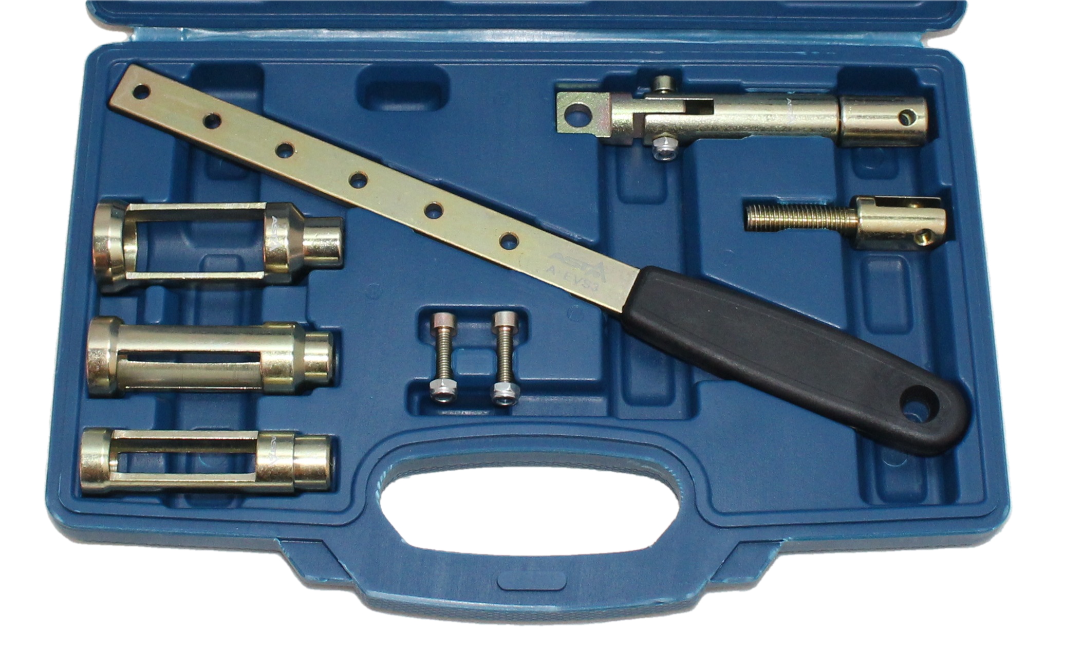 Dźwignia do ściskania sprężyn zaworowych z zestawem trzech różnych końcówek montażowych. Przyrząd znajduje zastosowanie w silnikach 8V, 12V ,16V, 24V, 30V.Przyrząd posiada regulacje wysokości oraz szerokości nacisku.Kieliszki posiadają stożki nacisku na miseczkę.