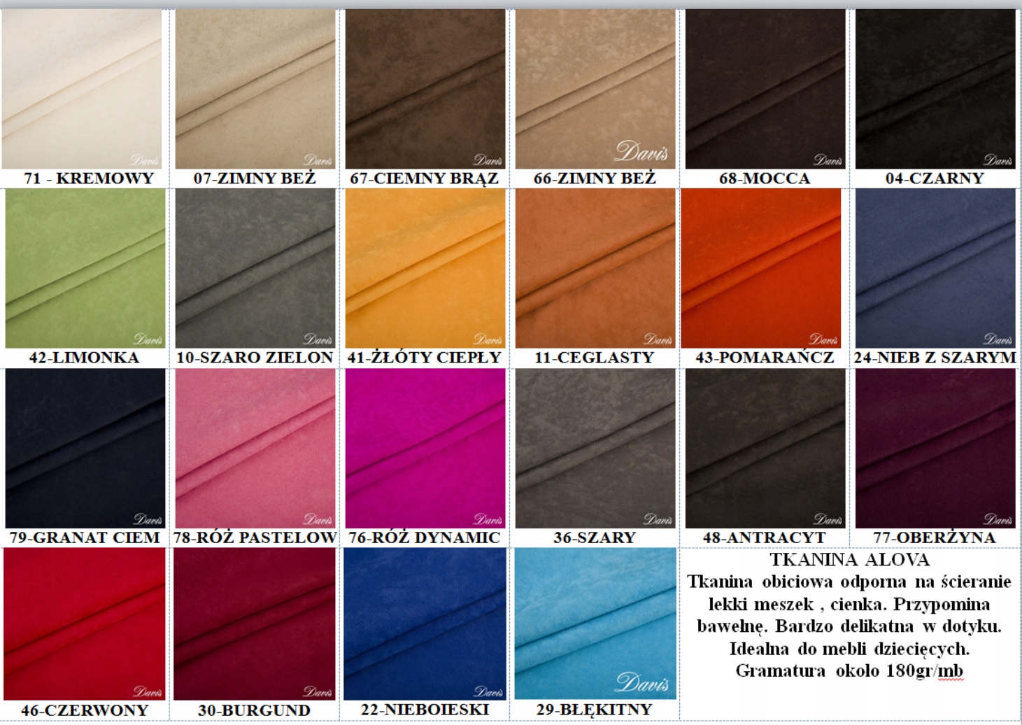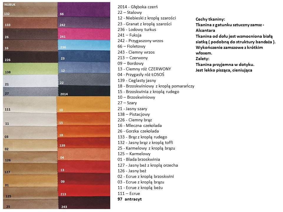 1-ecru , 2-beżowy , 3-piaskowy , 4-jasny brąz , 6-ciepły brąz , 7-gorzka czekolada , 24-ciemny brąz , 5-kamienny khaki , 25-khaki , 17-limonka , 29-lilia , 9-hortensja ,8-fuksja ,28-różowy , 10-jasny niebieski , 19-ciemny niebieski kobalt , 20-czerwony , 32- pomarańczowy , 31- jasny popiel , 12-popiel , 13 - szary , 14- ciemny szary grafit , 21 - antracyt , 15-czarny.