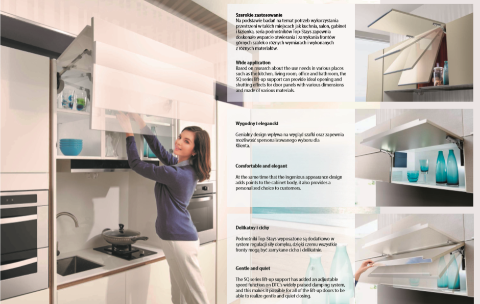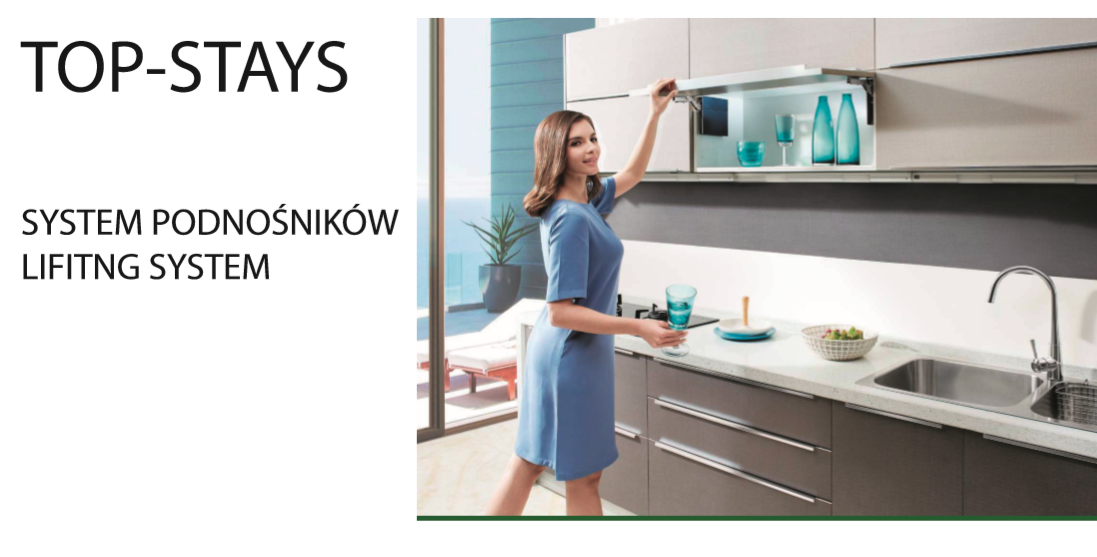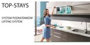 W momencie otwierania frontu wyczuwalny jest minimalny opór, następnie jego dalsza praca jest bardzo płynna, z możliwością zatrzymania w dowolnym położeniu, a po zakończeniu czynności system delikatnie i bezszelestnie domyka front. Dzięki bezpośredniemu przykręceniu okucia do boku korpusu front jest bardzo stabilny i pracuje nienagannie. Podnośniki Top-Stays są uniwersalne i można je stosować do wszystkich powszechnie występujących wysokości i ciężarów klap, również w meblach o niewielkiej głębokości.
