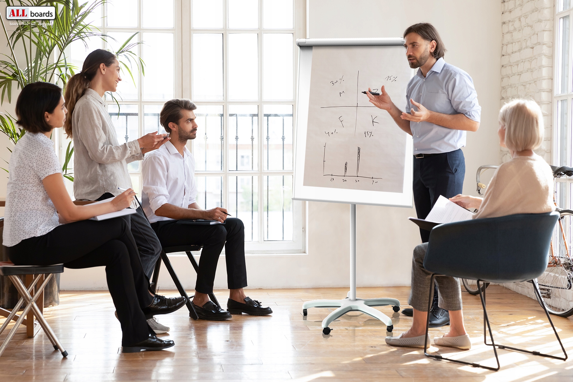 Przenośny flipchart stanowi doskonałe dopełnienie sal konferencyjnych, lekcyjnych, szkoleniowych oraz biur.