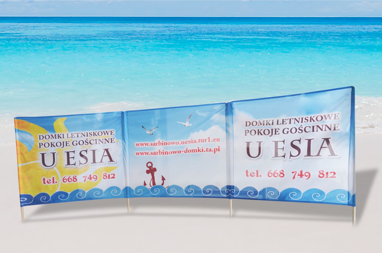 Parawan z nadrukiem to idealny nośnik reklamy na plaży podczas lata, duża powierzchnia pozwoli dobrze zareklamować Twoją firmę na plaży tak by inni plażowicze Cię zauważyli.