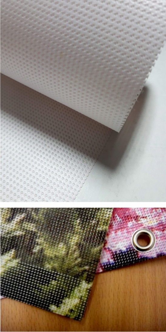 Материал ПВХ со структурой сетки. и очень прочный. Обеспечивает свободный поток воздуха, звука и света.