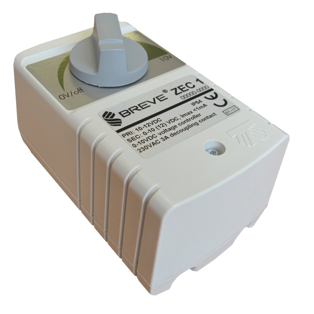 ZEC 1 Breve - zadajnik napięciowy 0-10V DC przeznaczony jest do płynnego zadawania żądanej wartości prędkości obrotowej wentylatorów wyposażonych w silniki komutowane elektroniczne (EC) lub innych urządzeń sterowanych sygnałem 0-10V.