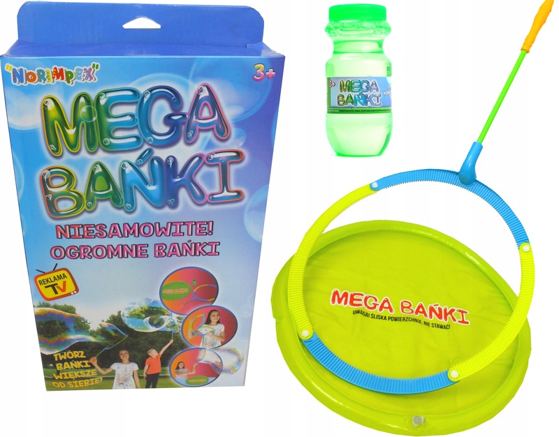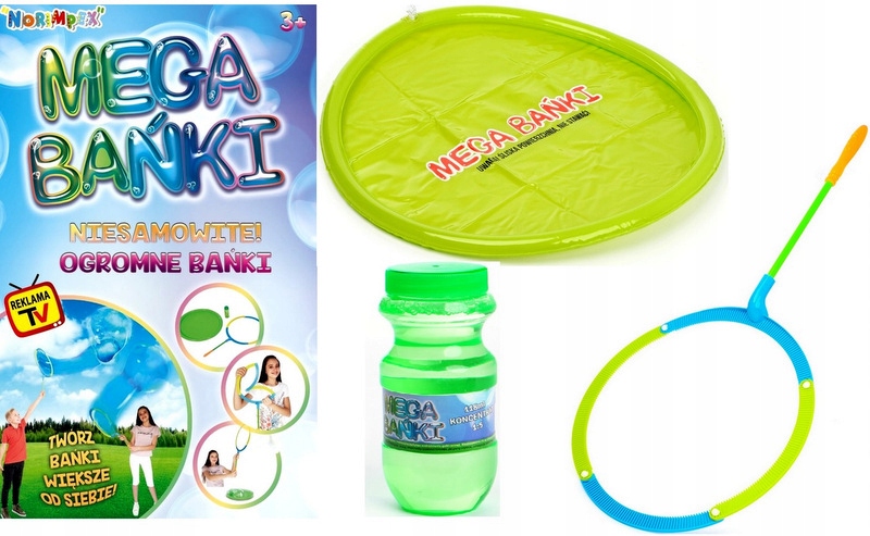 W skład zestawu wchodzi dmuchane rondo do którego, nalejesz płyn do Mega Baniek. Posiada ono odpowiednią średnicę i zostało wykonane tak jak basen z PVC, dlatego nie zajmuje wiele miejsca. Został również dołączony płyn do baniek w formie koncentratu 1:5 co daje 590 ml płynu do produkcji baniek. Olbrzymie bańki to nie tylko zabawa dla dzieci - każdy uwielbia je oglądać dzięki temu będą pewnym prezentem dla każdego.