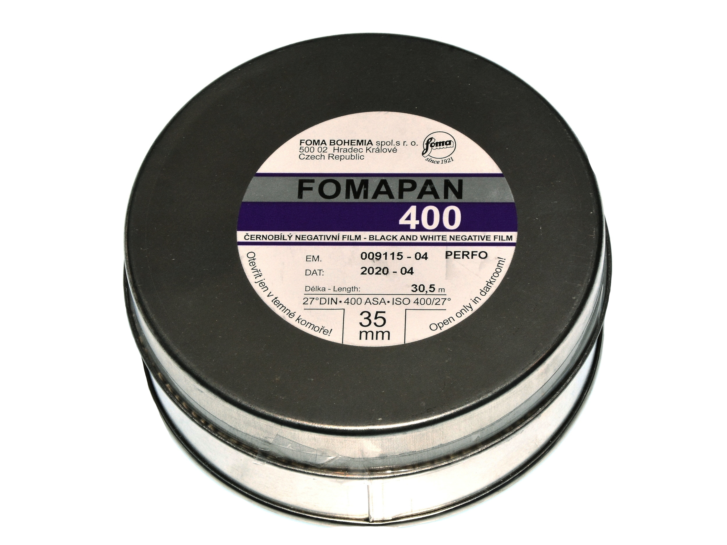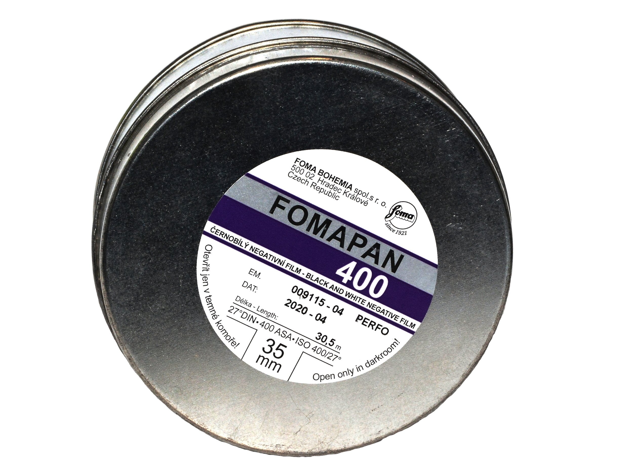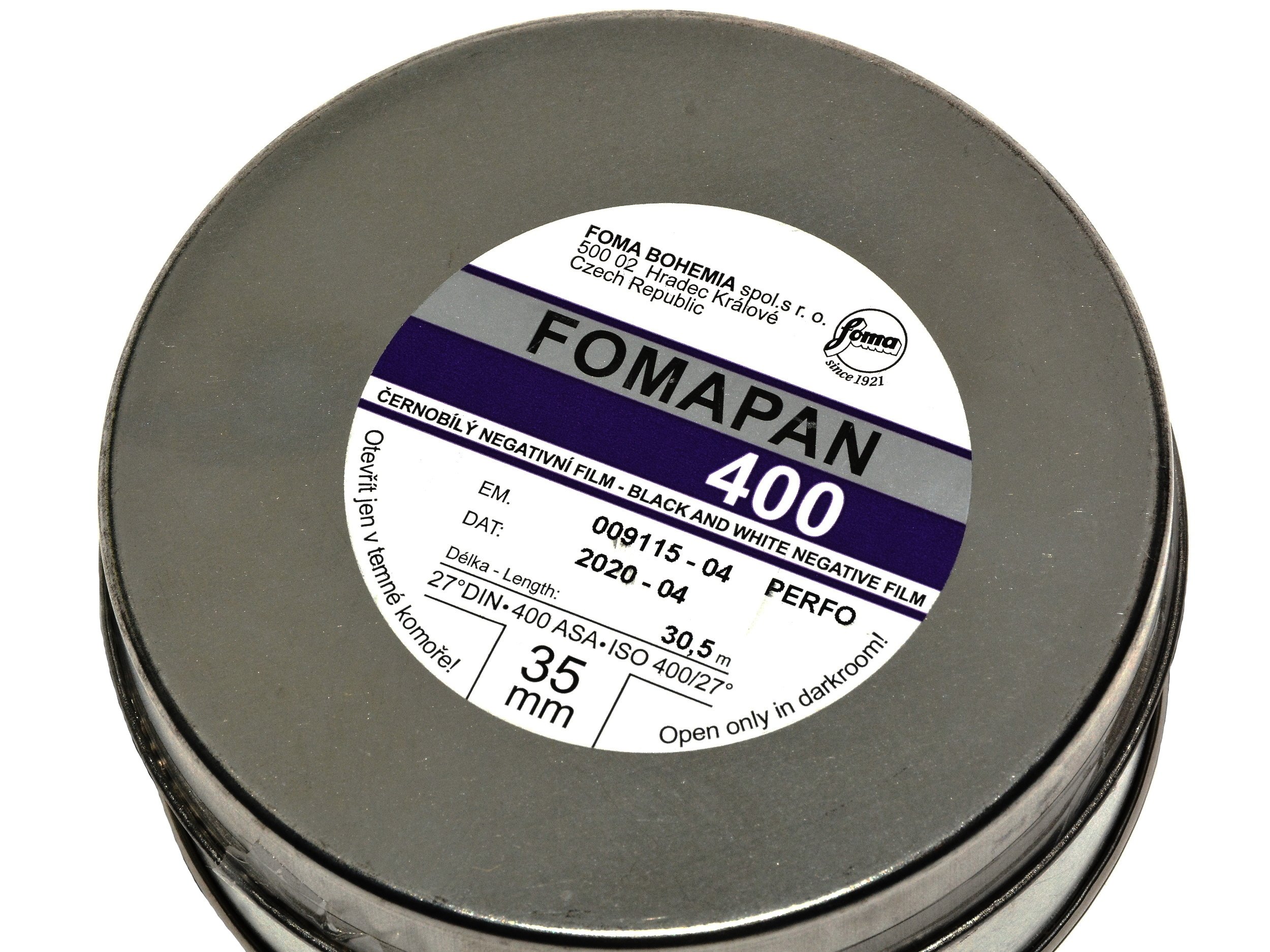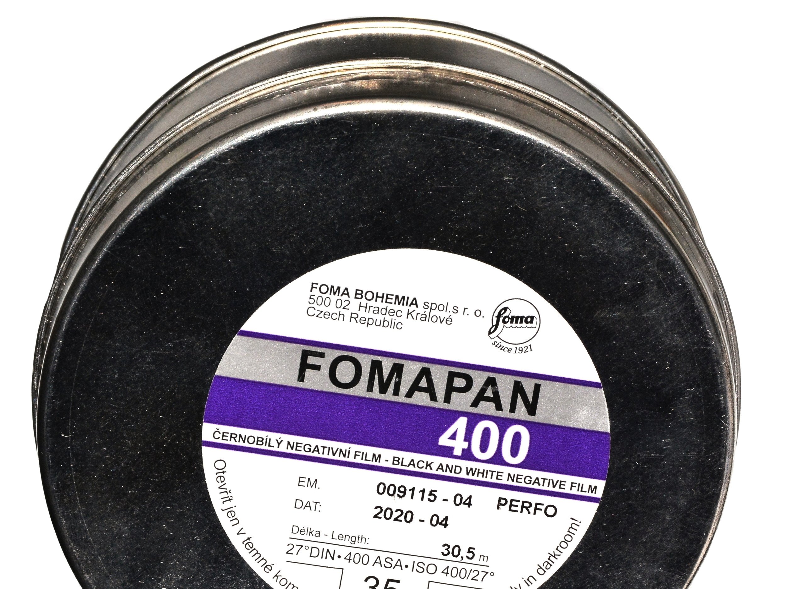 Opis artykułu: Małoobrazkowa klisza w popularnym formacie 35 mm. najczęściej do zdjęć w formacie 24x36 mm. - amatorski negatyw o uczuleniu panchromatycznymi o dość wysokiej czułość 400 ASA - 27 DIN. Z materiałów czarno białych czulsza jest tylko Delta 3200/36 Ilforda. Opakowanie w puszce zawiera 30,5 metra filmu, co starcza na przygotowanie ok. 17 - 18 filmów 36 klatkowych - każdy o długości 1,7 metra. Do przygotowania filmu potrzebne są kasety plastikowe lub metalowe wielokrotnego użytku. Można także przyklejać ucięty i odmierzony film do końcówek filmu wystającego z kaset jednorazowych. Do odmierzania, obcinania filmu i ładowania go w kasetę przydaje się także zgrabne urządzenie do w/w celów. Zarówno kasety jak i ładowarkę do filmów polecamy w naszej ofercie. Film Fomapan 400 przeznaczony jest fotografowania w wielu standardowych sytuacjach. Można go stosować w dobrym, średnim i gorszym oświetleniu. Daje się forsować w górę i w dół o 1 przesłonę czasem więcej... Foma 400 jest kliszą dającą wyraźnie NAJMNIEJSZY kontrast z filmów Fomapan i chyba największe ziarno oprócz Delty 3200. Naświetlanie filmu na 200 ASA zmniejszy jeszcze bardziej kontrast i ziarno. Forsowanie na 800 ASA powiększy znacznie kontrast i ziarno. Obróbka w wywoływaczach do tradycyjnej emulsji: Atomal, Rodinal - R09, Kodak D76, Ilfosol S, Utrafin itd. Fomapana 400 można obrabiać w wywoływaczach przeznaczonych do Delty i T-maxa - wtedy uzyskamy mniejsze ziarno i lepszą tonalność. To chyba film z największym ziarnem z dostępnych na rynku filmów. Fomapan 400 jest filmem o tradycyjnej srebrowej emulsji. data: styczeń 2022 r.