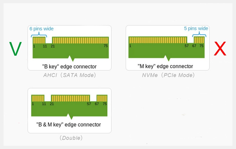 W związku z licznymi zapytaniami informujemy że przejściówka obsługuje typy dysków o złączach tz "B key" oraz "B & M key" natomiast nie obsługuje dysków o złączu "M key" tak jak przedstawiono to na grafice obok.