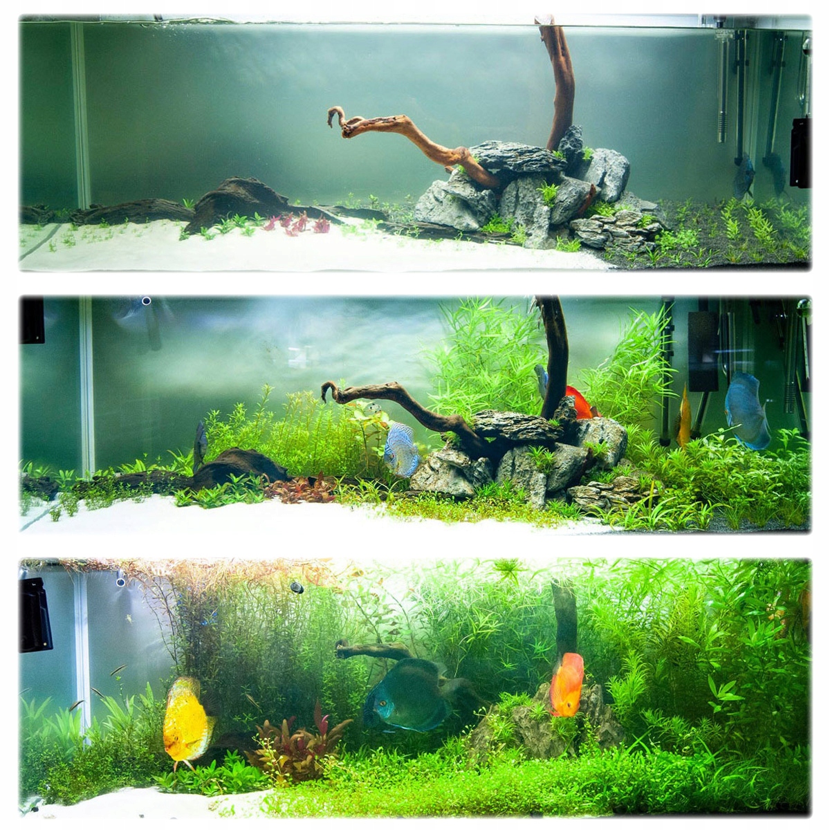 Ниже представляем несколько фотографий одного из наших фирменных аквариумов. Представленный бак полностью засажен растениями in vitro, которые вы можете купить в нашем интернет-магазине. Посадили в нем также большинство видов состоящих на данный комплект. На фотографиях видно, как легко приняла в себя растения и как быстро и пышно порослы весь бак. Фотографии сделаны в 1, 14 и 70 день жизни аквариума